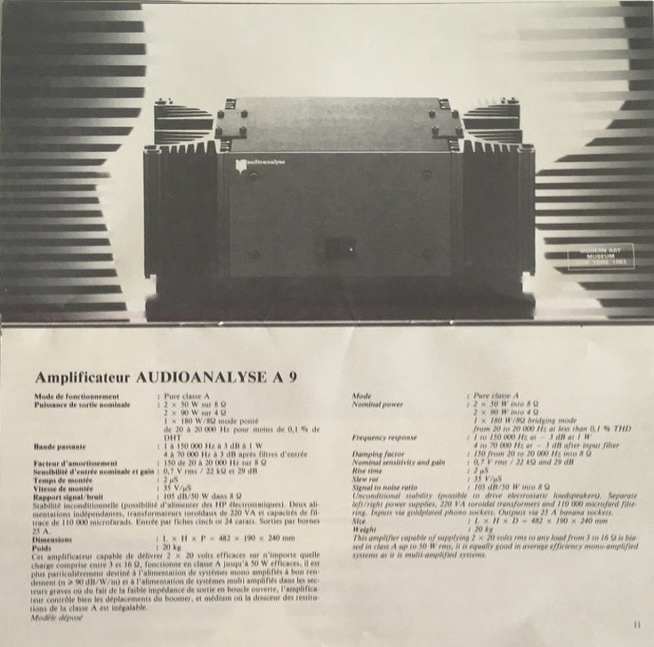 A tech. spec. ben azt írják, hogy a teljesítménye 8 Ohmon 50W 4 Ohmon 90W, és hídba kötött mono blokként pedig 8Ohmon 180W. Ez elég grandiózus teljesítmény. A képen egy mohóca kis erősítőnek néz ki, de a dimenziói mellbevágóan nagyok a maga 482x190x240mm erével, 20kg os tömegével. A NETen találtam egy leírást is róla, hogy a toroidokat szokatlan módon egymásra építették, aminek következtében az alsó trafó hajlamos volt elhamvadni. Egy holland csóka lecserélt a 2x220Wattos trafókat 2x300W osakra, és azóta megbízhatóan müxik. A fenti rajzot is Ő csinálta. Itt van még pár érdekesség róla http://www.audiotecnico.it/riparazioni/riparazioni_A/Audioanalyse/A...A9.htm. Érdekes egy cucc. Sajna nekem kevés a tudásom ahhoz, hogy megépítsem, vagy leszimuláljam. Pedig érdekes lenne megcsinálni.