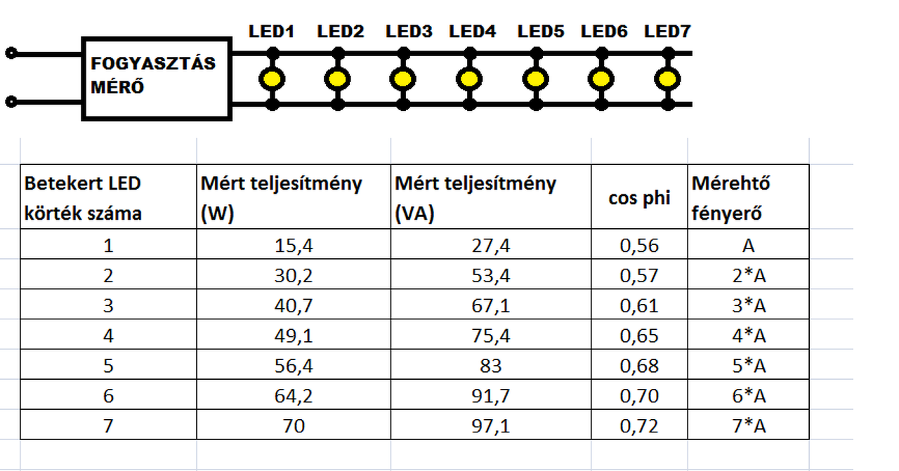 1 darab égő 15,4W-ot fogyaszt, 6 darab együtt viszont csak 64,2W, holott a fényerő hatszorosára növekszik. Értetlenül állok a jelenség előtt. A másik dolog, hogy a mérő műszer Voltcraft Energy Monitor 3000, ki tud írni W, VA és cos phi értéket is. A VA nagyjából el is éri a 90-et a 6 égőnél, de erre betekertem egy 7. égőt és csak 7-el növekedett. W, VA mik ezek? Mi a különbség?