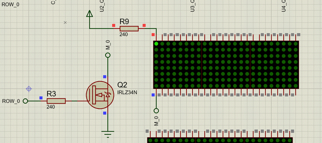 Kérhetek egy kis sgítséget? Van egy mátrix kijelzőm, meg egy MOSFET-em, amit egy PIC kapcsolgat. A szimulátor szerint folyamatosan ég a mátrix összes ledje. Ha Led-et rakok a mátrix helyére, az villog. Ez a szimulátor hibája, vagy valamit én gondolok rosszul? Csatolok egy képet a leegyszerűsített kapcsolásról.