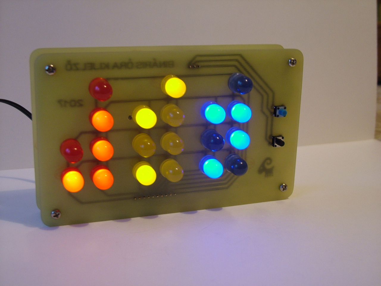 Már többet építettem, de itt még nem publikáltam egyet sem. Ezt azért kellett összeraknom, mert megmutattam az egyik szomszéd asszonyomnak a bináris karórámat, és annyira megtetszett Neki a leolvasás technikája, hogy megígértem Neki, hogy kap tőlem egy bináris órát gyakorolni.