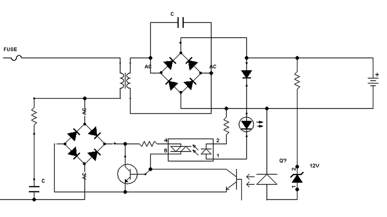 Csepptöltőt építenék, folyamatos üzemre. A trafó adott, pár wattos 12V AC a névleges szekunder. Készítettem egy elvi rajzot (a 12V-s zéner értéke is pontosítandó).