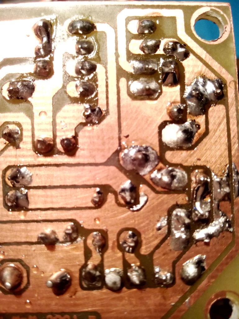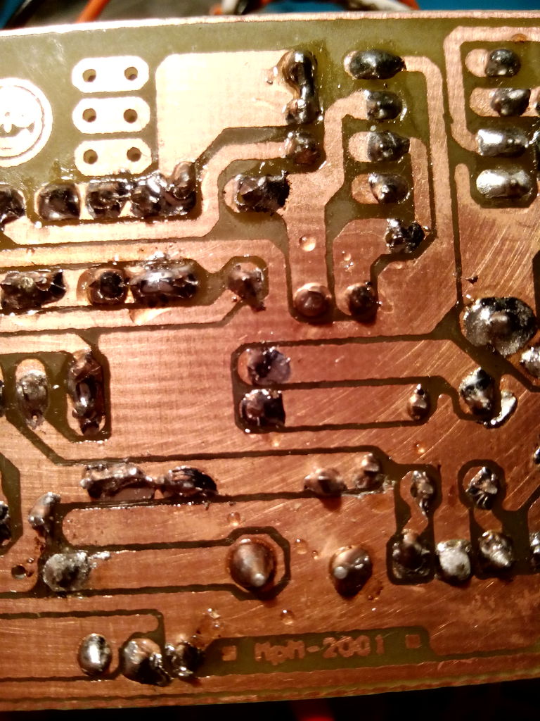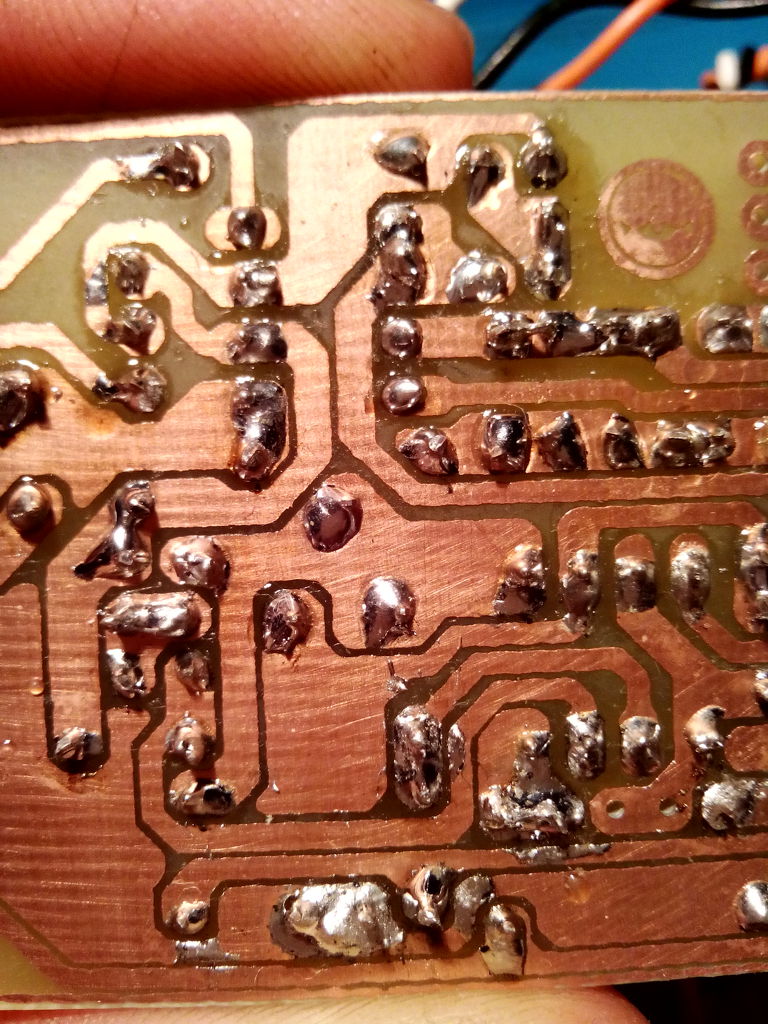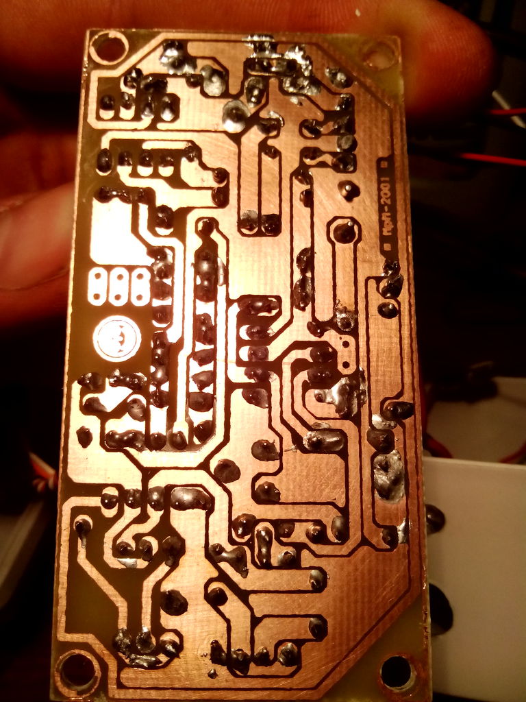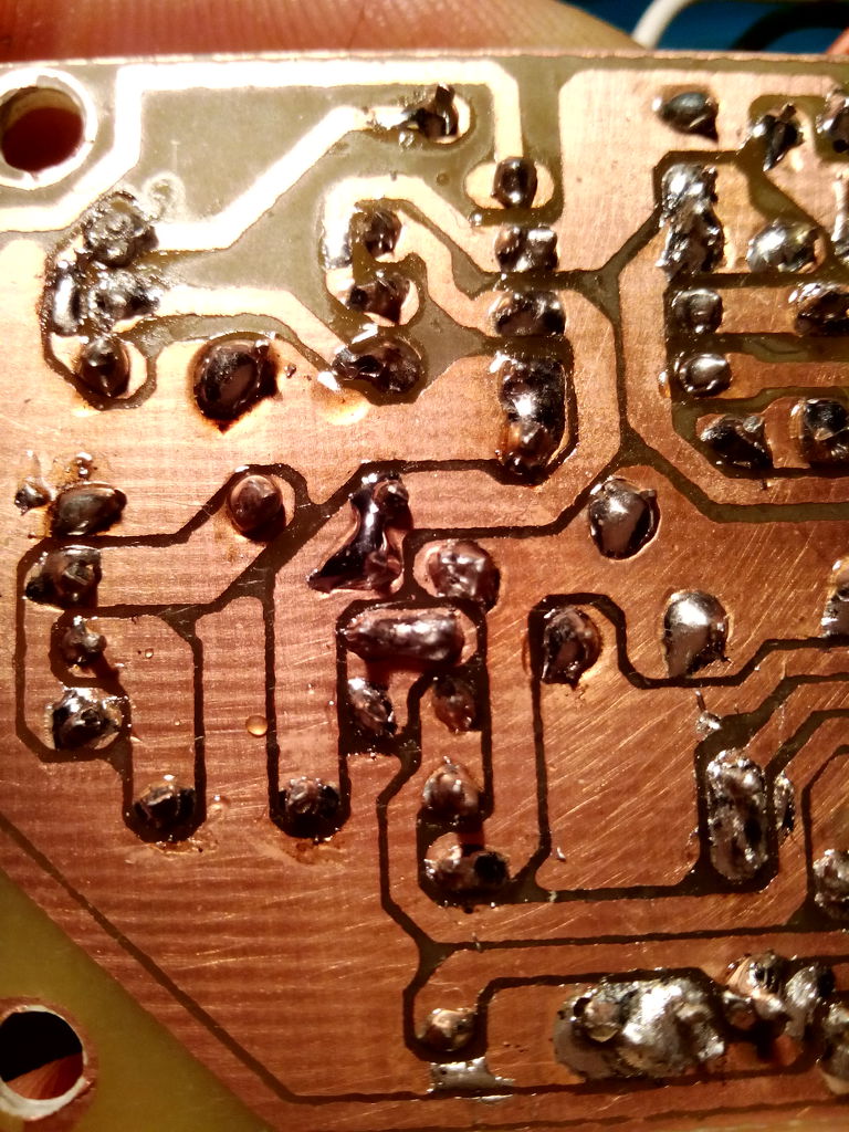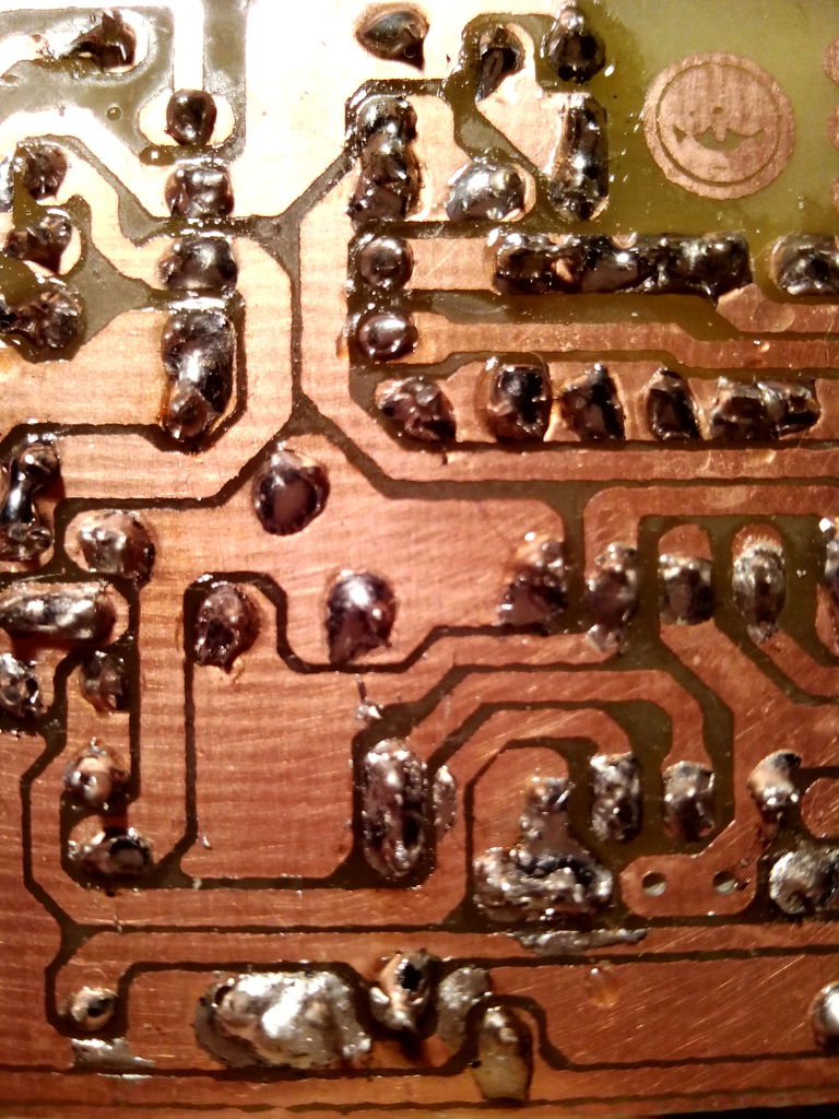 Ráérős időben azért majd le kéne mosni denaturált szesszel, vagy nitróval a forrasztási oldalt, mert a gyantában megbújhatnak vezető anyagok. Úgy látszik itt-ott parányi óncseppek is vannak.