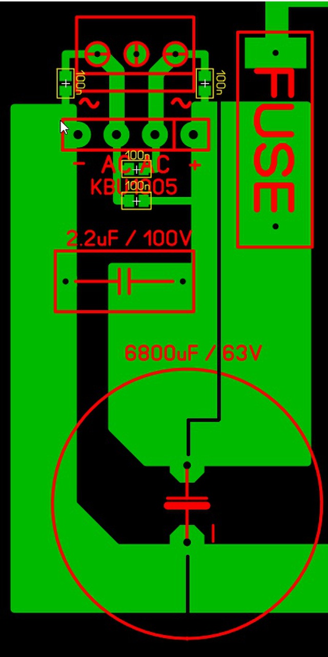 ![]() Egyenlőre úgy terveztem a NYÁK-ot, hogy 2db 4.700µF vagy 1db 10.000µF lesz.