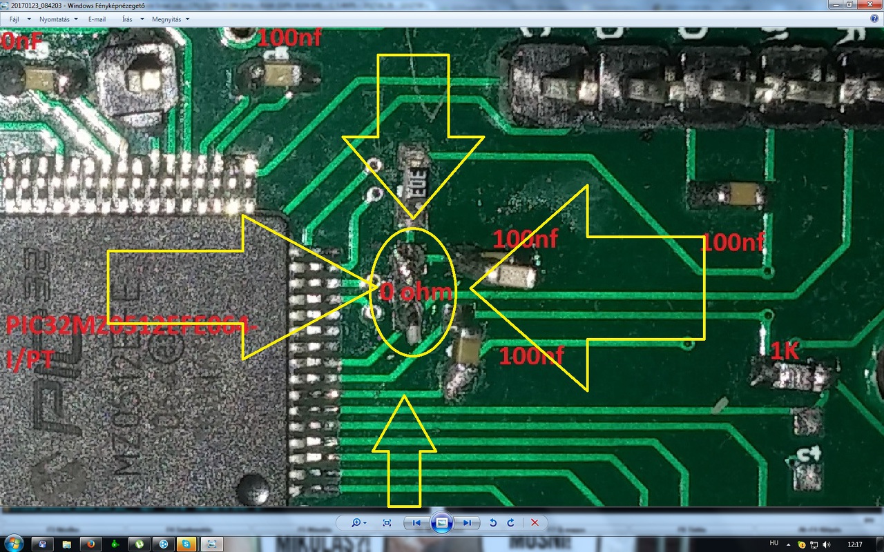 A pic lábánál egy 0R értékű átkötés van, de az eredetinek tűnt számomra... Az én szemem olyan vezetékes kokányolást keresett, mint ami a kijelzőn is van. De akkor megnyugszok és beültetek oda egy átkötést és le vannak tudva a "hibák".