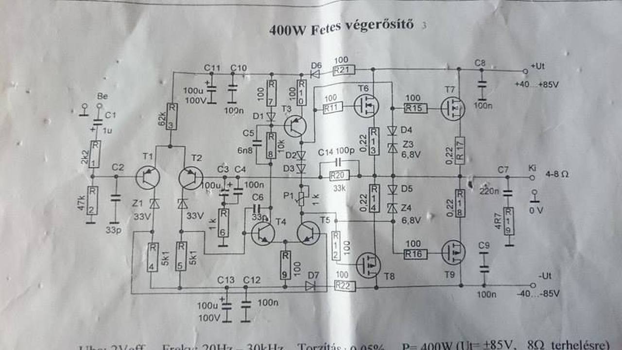 A szóban forgó 400W -os fetes végfokba viszont nem elég az a két diódából és egy trimmerből álló nyugalmi áramot állító kör. Ez potenciális veszélyforrás, mivel ezek az IRFP fetek hajlamosak a hőmegfutásra. Az meg nem elég kompenzáció, hogy azt a két diódát a hűtőbordára szereli az ember, hogy hőkontaktban legyen a végtranzisztorokkal.