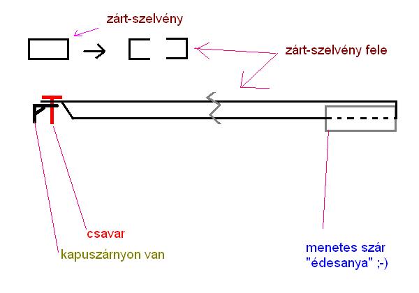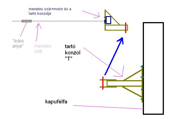nagy vonalakban: - elektro rész: 5db 555-s időzítő lesz(igen makacs vagyok!!!), 3 relé, 1 készenlét-trafó, 1 telj. trafó, 2 db Trabant ablaktörlő moci. mechanika az brutál egyszerü lecc.. van 20*40 es zárt szelvén, ezt elvágom 2-é... inkább rajzolok ![]() lsd csatiban! a menetes szár "édesanya"-ba megy a menet, a menetes szár végén a moci. mocit meg 1 T alakon rögzitem a kapufélfán ![]() ennyi! jövöhéten "lehet" h el is készül