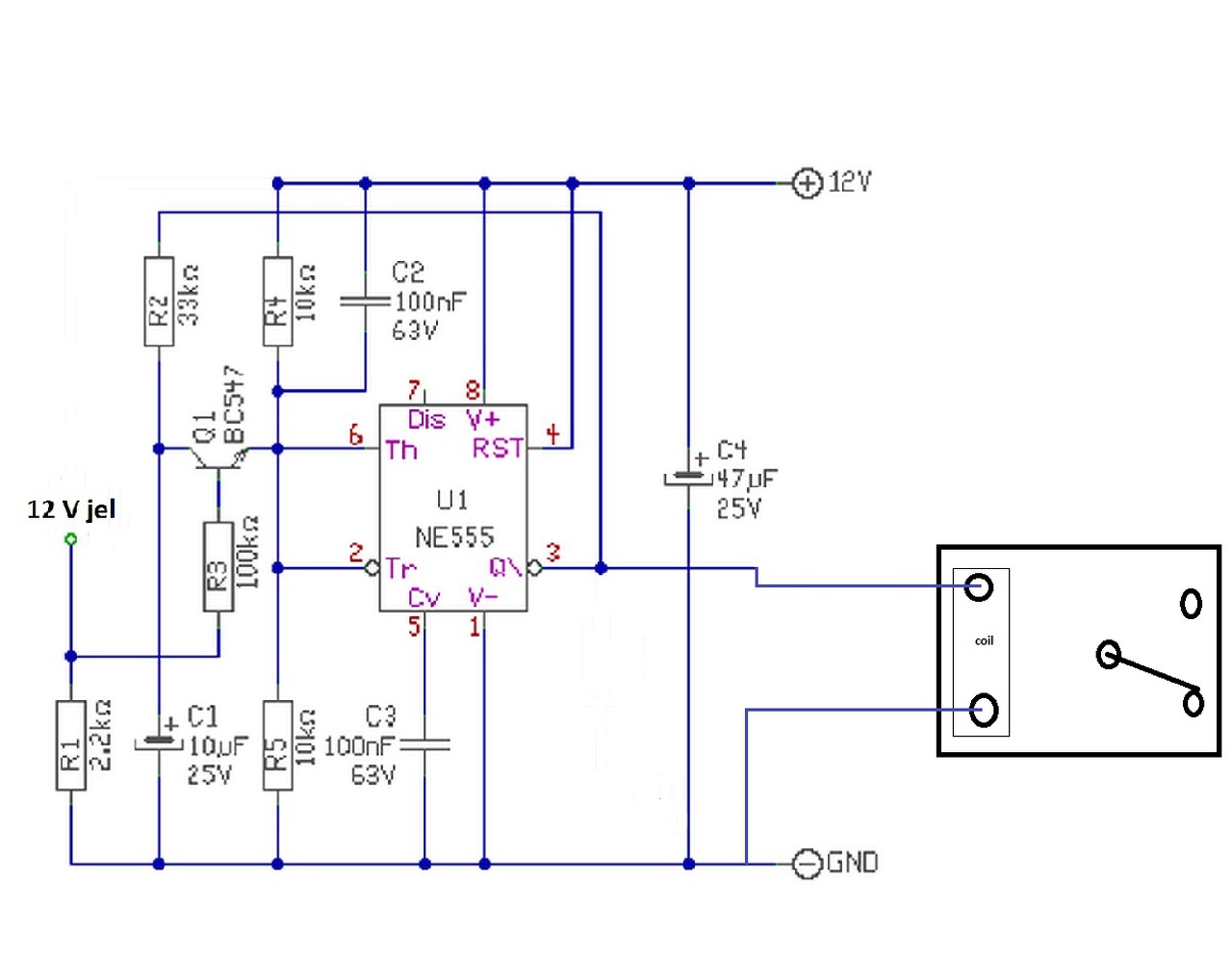 - "-12V 0.5 sec jel" Ezt én úgy értelmezem, hogy egy kontaktus erre a 0,5sec időre testet kapcsol. Tehát ugyan azt teszi,mint a nyomógomb. Tehát a jelforrásodra az R1-R3 közös pontját kell bekötni. (De ha a 12V előtt az nem a negatív előjelet jelent, hanem kötőjel volt, akkor más a helyzet. Viszont ekkor a kettő között egy üres karakter helyet kellett volna hagyni.)