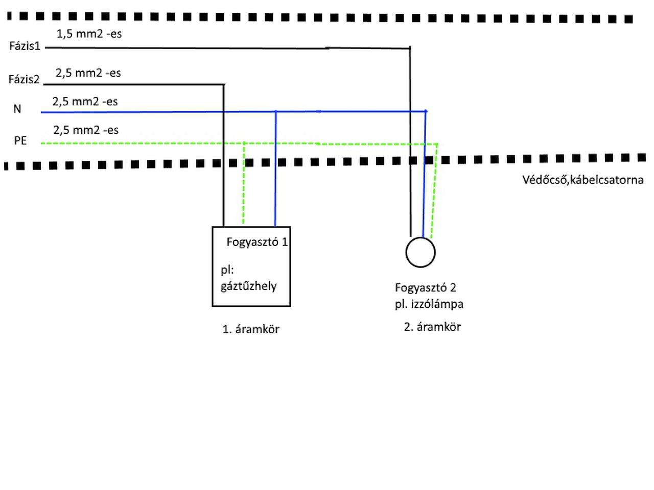 Egy másik eseten pedig a következőn gondolkoztam. Ha pl. én egy 2,5 mm2 -es vezetéket fázisként, egy másik 1,5 mm2-es vezetéket szintén fázisként szeretném elvezetni egy fogyasztóhoz ugyanabban a csatornában, akkor ebben az esetben lehet olyat tenni, hogy az 1,5 mm -es vezetékhez tartozó 1,5 mm2-es N -et és PE-et nem vezetem be külön, hanem leágaztatom a 2,5 mm -es vezetékkel a 2,5 mm2 -es vezetékről? Vagy ez így teljesen szabálytalan?
