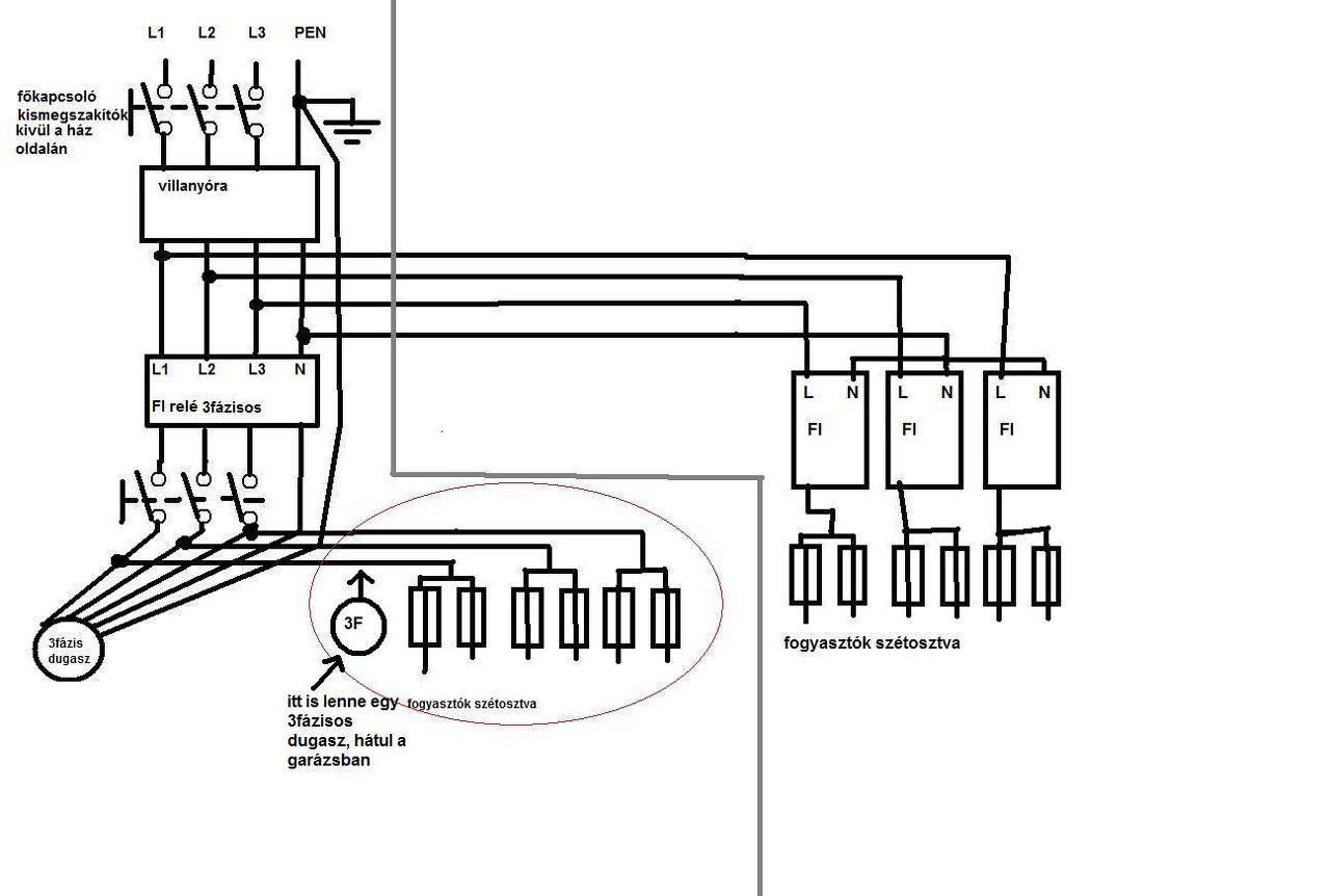 A bal részben az FI relé után lenne egy 3fázisos kismegszakító, a 380 dugasz miatt. Egy dugasz lenne a ház elején a pincébe (mert most is van, és kell is oda), és a másik párhuzamosan kötve hozzá, hátul a garázsba, ha kellesz valamikor betonkeverő, mert másra nemigen.