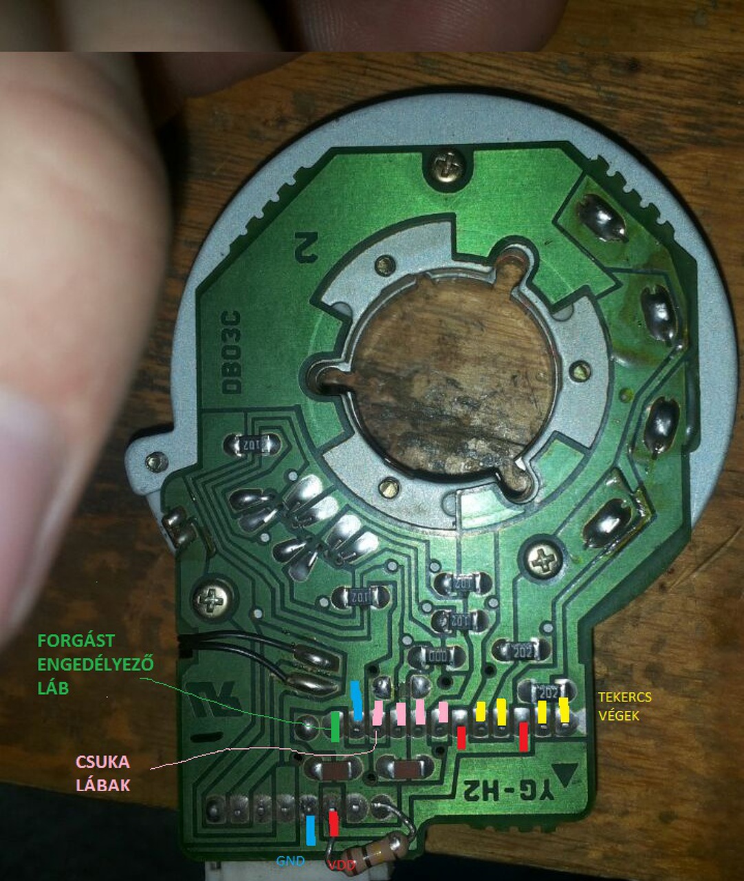 Hány gnd van?Illetve hány vcc? Az egyik gnd vagy taprakotott láb lesz a forgasirany. Ha van olyan ami ellenállásonketesztul vcc vagy gnd de nem vesz osztó akkor az lesz az.