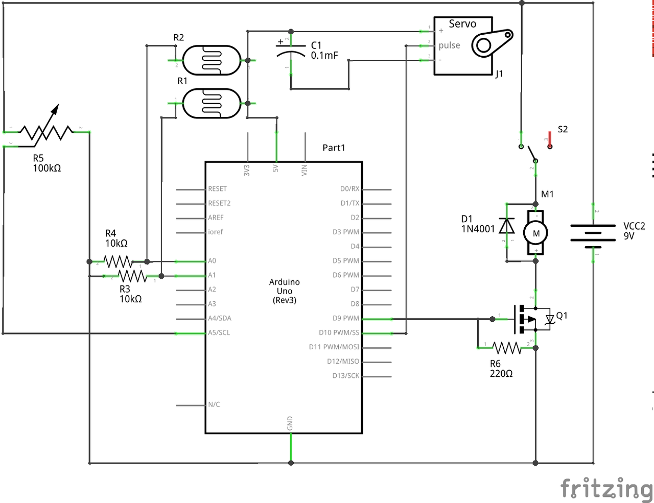 Ami az Arduino lapot illeti. A kapcsolási rajzon nem látható, hogy az Arduino lapnak külön áramforrása van, mely kétféle lehet: vagy számítógép USB portjáról, vagy fali adapterről, mely egyenáramot ad, s melynek feszültsége az ajánlás szerint 7-12V.