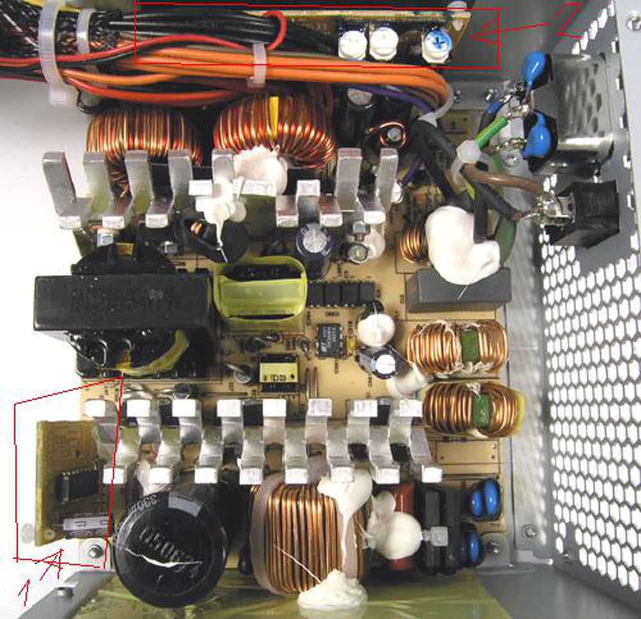 Egy kis segitséget szeretnék kérni Pc táp átalakitáshoz. Szereztem egy Chieftec 450W tápot amiböl labor tápot szeretnék csinálni a leirások alapján, viszont kicsit se találok rajta olyan IC-t amiröl irnak mert elég hülye helyen vannak.Kérdésem hogy a mellékelt rajzon 2 helyen bejelölt paneleken látok IC-ket amik sajnos nem igazán láthatoak,melyik panelt forrasszam ki hogy azon megcsináljak az átkötéseket.Az egyik panel a betáphoz van közel szoval arra gondolok hogy az bemeneti áram szabályásáért felel.A másik panelen van a power good jel kábele és a power on kábel plusz a venti kimenete.Melyiken lehet az a vezérlö IC ami feszültség modositására ad lehetöseéget illetve amit piszkálnom kell.