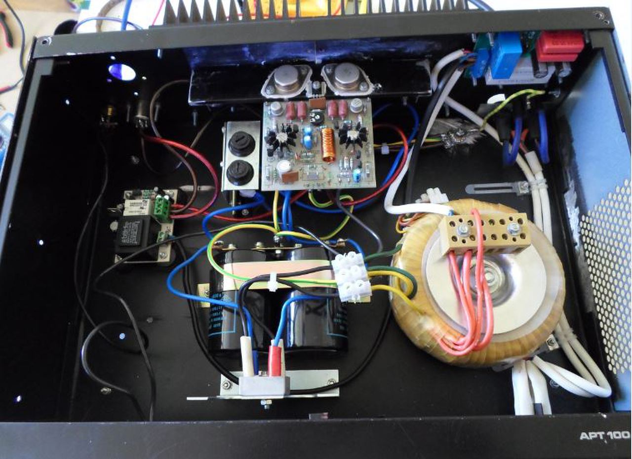 Sziasztok!Elkészült a doboz is nagy vonalakban az erősítőnek,meg voltak az első tesztek is.Két nehéz nap ,és megannyi buktató ,ez jellemezte ezt a project-et.Például sötétedés előtt nem sokkal még flex-elnem kellett a teraszon,de közben elfogyott a csavar,ami abban a boltban kapható ami korán zár.Aztán összerakásnál este 11-kor jöttem rá,hogy többféle biztosíték ház létezik ezekhez a típusokhoz,és amit én próbálok sapka az nem az ami kéne.Zseblámpával rohangáltam kint,de csak egy óra múlva lett meg a kettő...Aztán a koppanásgátló a dobozban nem indult ,nem húzott be a relé,míg végül rájöttem,hogy nem elég neki az 5 mm vastag gumitalp,meg kell még emelni.Ez azért érdekes.Aztán a tápot méregettem, 0,2 volt DC eltérés a két oldal közt,kezdtem ideges lenni.Húzogattam a kondenzátorok szorító csavarjait,feszegettem a forrasztásokat,amit csak ki tudtam találni,mert a váltó áram az tizedre stimmelt a két oldalon.Aztán cseréltem a biztosítékokat a tápban, a graetz-et,de semmi.Így maradt.De kaptam kondenzátor kisütő ellenállást,és nyugodt voltam az élesztésnél.Aztán az XLR dugót amit forrasztottam a kábelre amit rákötöttem később az erősítőre (mert én kizárólag XLR-t használok a hangsugárzók csatlakoztatására ),a biztonság kedvéért megnéztem szakadásvizsgálóval ,és akkor derült ki,hogy fordítva forrasztottam a dugóra a két pólust....És most valahogy más a hangja mint a deszkán volt,nekem úgy tűnik.Az apt 100 az sokkal közelebb áll hozzám ,a bd-s,ez a mag100 így ebben a formában nem fog megmaradni itt,kiteszem a műhelybe...Ennyit tudok mondani.Bár nem értek szinte semmihez,csak a pirosat a pirosba kötöm,aztán hallgatózok...