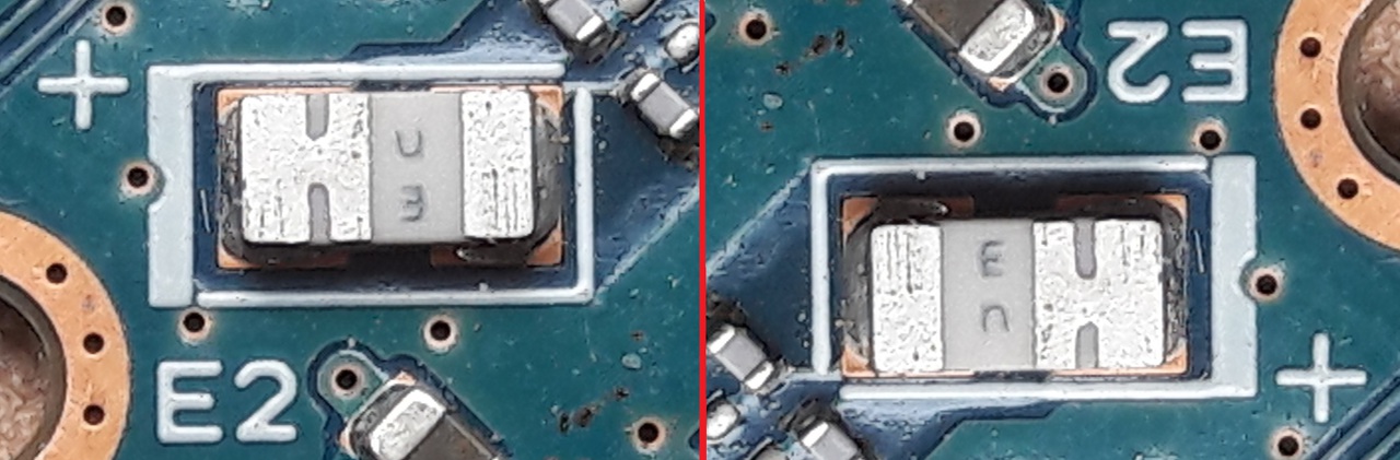 Az alkatrész poziciószáma E2 (ezt írja a nyákon), az alkatrészen U 3-at ír . De ha megfordítom, akkor n 3-at ír.