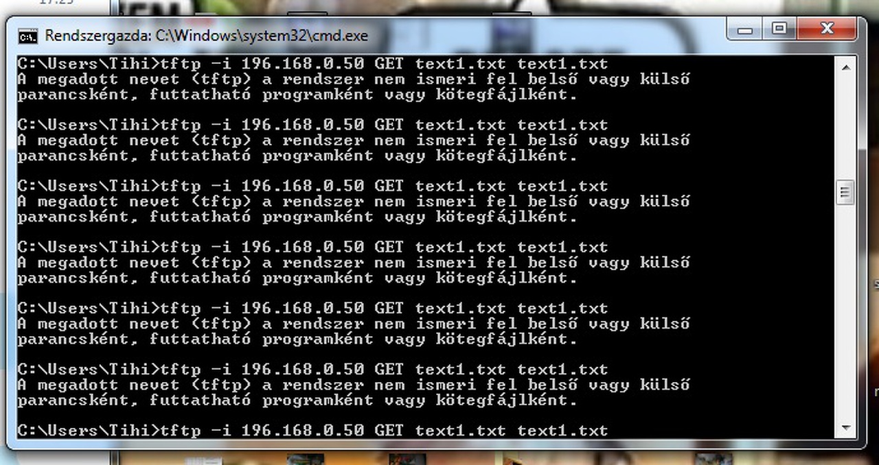 fontos a WINDOWS tűzfal alapból fogja a TFTP-t !!!!!! A GET után editorral szerkeszted a filet majd PUT A hozzászólás módosítva: Feb 28, 2017