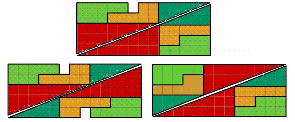 Megrajzoltam Eagle-ben, grid-nek megfelelően egy példányban, másoltam az egészet, összerakva valóban maradt egy üres négyzet. Aztán printscreen, Paint-ben kiszíneztem, és húztam a grid pontjaiból egy-egy vonalat; amennyit "elcsal" az egyik ábrán, annyit hozzátesz a másikon. És mivel csak egy területegység felét kell elcsalni (a nagy elvileg 32.5 egység lenne), az simán belefér a vonalakhoz.