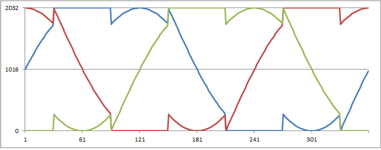 A másik gond az, hogy mint említettem ez nem sima szinusz táblázat. Ha fogok egy sima szinusz táblázatot és abból állítom elő a szinuszokat akkor két fázis között nem szinusz lesz, legalább is jóval kisebb amplitúdójú és csak szakaszos szinusz. Matematikailag ugyan működik, hogy két szinusz összege is szinusz, csak a félhidaknál ez már nem így működik.