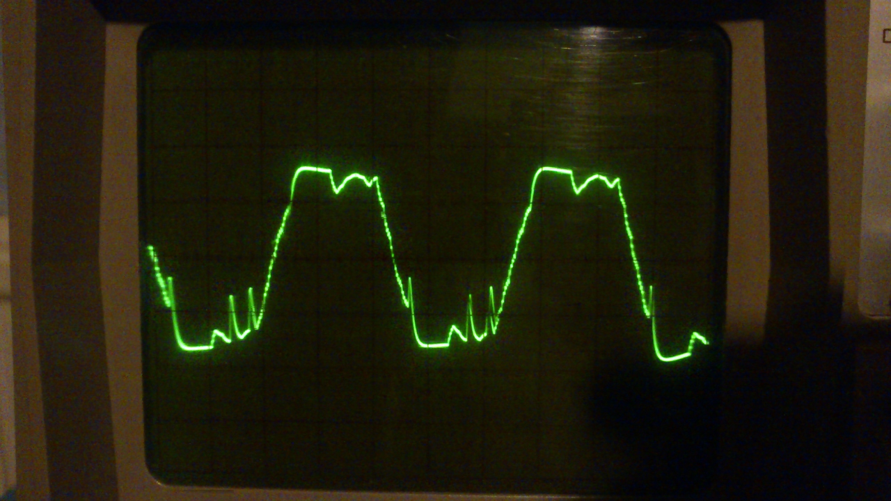 Minden esetre nem találom a hiba okát próbálom számolgatni, de semmi. Annyit javítanék, hogy 2db tűske van egy periódusban és mindkettő visszafelé hat azaz azon a két helyen esik a feszültség. Elég körülményes a hiba megtalálása, mert rendes modulált két fázis közötti szinuszt állítok elő szóval nem a szokványos szinusz függvényt kell használni hanem egy trükkösebbet, de maga a függvény biztos, hogy rendbe van, mert 253 és az alatti amplitúdó értékekkel minden ok.