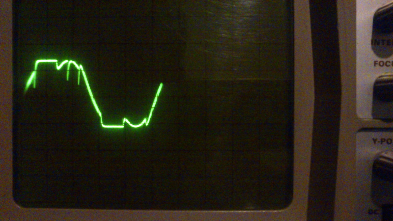 Minden esetre nem találom a hiba okát próbálom számolgatni, de semmi. Annyit javítanék, hogy 2db tűske van egy periódusban és mindkettő visszafelé hat azaz azon a két helyen esik a feszültség. Elég körülményes a hiba megtalálása, mert rendes modulált két fázis közötti szinuszt állítok elő szóval nem a szokványos szinusz függvényt kell használni hanem egy trükkösebbet, de maga a függvény biztos, hogy rendbe van, mert 253 és az alatti amplitúdó értékekkel minden ok.