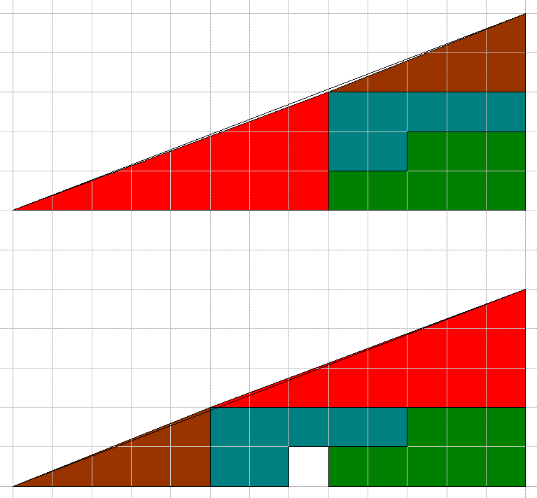 Egész pontosan úgy van, hogy a nagy háromszög elméletileg 32.5 terület-egység (5*13/2), a lefedettek az első ábrán 32, a másodikon szintén 32 egységet adnak, de a másodikon ugye van még egy üres is, emiatt az 33. Vagyis, csalás lehet a nagy háromszögben.