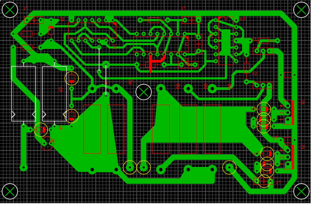 - Nem csak hogy nincs összekötve 11-13, nincs is a tápra kötve. (piros) - Ezen felül a bementi pontok méretét kicsinek látom, mint ahogy a GND-pont vezetősávját is ami a tranyók emitteréhez vezet. Mert ott tetemes áramok fognak folyni. (piros) - A diódák mérete kicsi. Meg kell nézni a valóságban mekkorák, mert nem lehet majd beültetni. Mint ahogy a C6 mérete is kicsi lesz, úgy látom. - A nagyfeszültségű pontok egymáshoz képesti távolsága ia ellenőrizendő. Itt a trafón, 400V-os impulzusok lesznek. Ha közel vannak a pontok, "át fognak nézni egymáshoz". Egyszóval nyákot tervezni az alkatrészek méretének ismerete nélkül, elég nehéz.. A hozzászólás módosítva: Márc 5, 2017