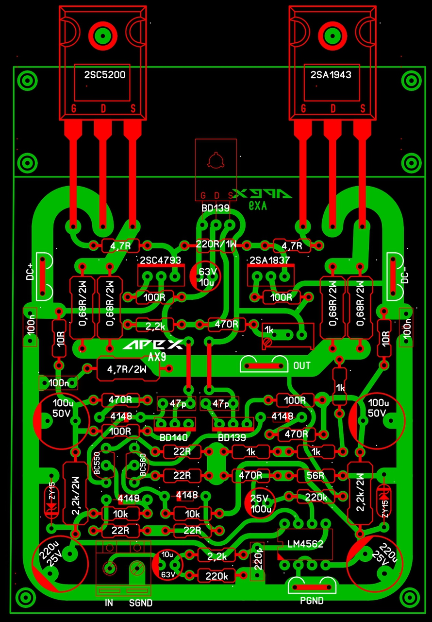 Kedvet kaptam egy tranzisztoros erősítőhöz, és meg is van a kiszemeltem: Elkészítettem a NYÁK tervet is, remélem jó lett. Pozíciószám nincs a kapcsolási rajzon sajnos. Megnéznétek? Előre is köszi.