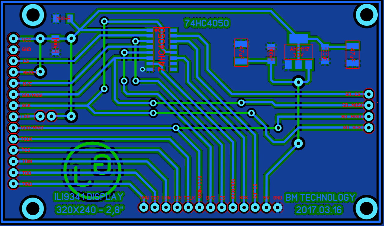 Érdekes hibával szembesültem. A héten terveztem egy szintillesztő áramkört ILI9341 SPI kijelzőhöz. 74HC4050-es IC van rajta, meg egy 3,3V-os stabilizátor. Két oldalas nyák lett, bár egy oldalas is lehetett volna, ha átkötéseket használok. Mellékeltem a tervezett fólia rajzot. Tegnap meg is csináltam. A kijelző, az SD kártya, valamint egy W5100-ás ethernet modul is szépen kommunikál egymással a spi vonalon. Azonban ha rákötök egy NRF24L01-es modult, az már nem. Egész éjjel ezzel szórakoztam, mert próbalapon jó volt a vezetékekkel, és nem értettem mi lehet, hogy itt meg nem. Közben kiderült, hogy ha lehúzom az SDO/MISO lábat a készített panelről, és azt külön kötöm rá egy vezetékkel az SD kártyára és a kijelzőre, akkor az NRF modul is működik. De ha újra visszarakom, akkor ismét nem megy az NRF modul. Valószínűleg a SPI vonalon zavar keletkezik, de ez csak tervezési hiba lehet. Mit gondoltok, ha megnézitek a mellékelt rajzot? Ezek a keresztezések okozhatnak ilyen gondot? Első gondolatom nekem az, hogy megcsinálom egyoldalas tervezéssel, átkötésekkel. Köszi a válaszotokat előre is!