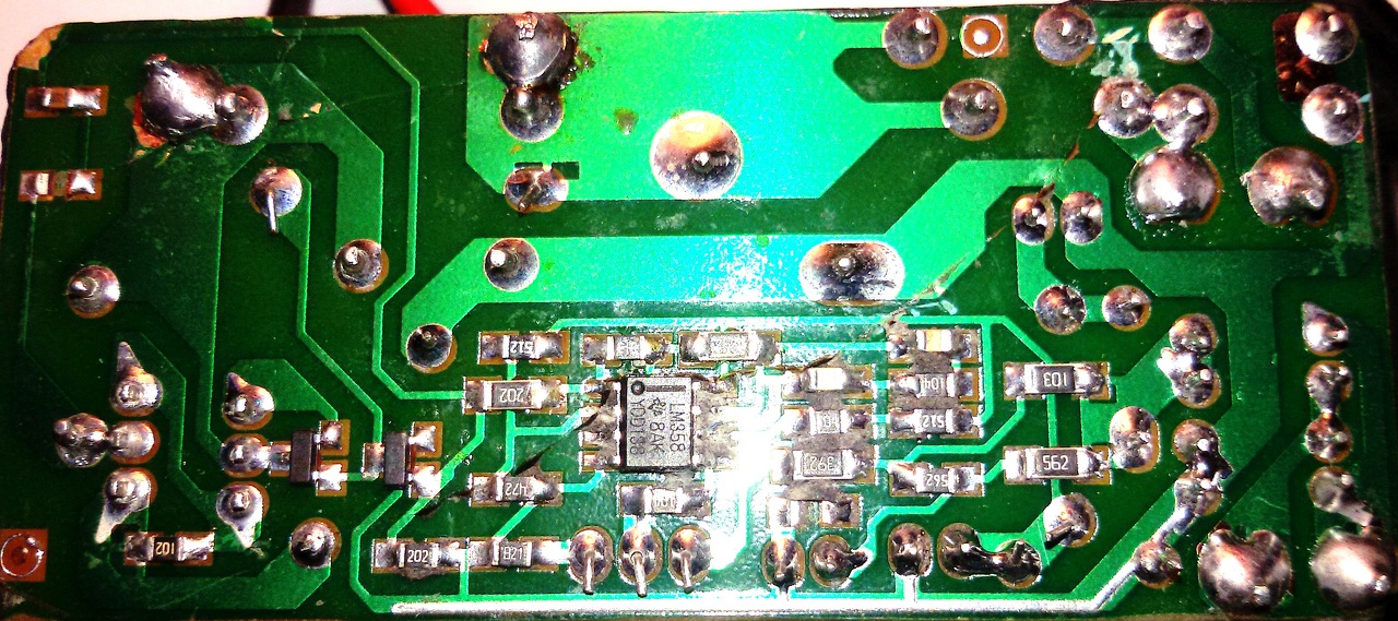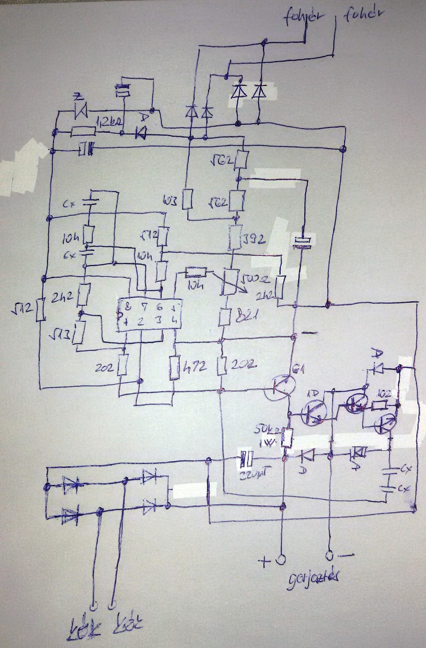 A tönkrement szabályzót mostanra tudtam kirajzolni de, hogy jól rajzoltam e ki azt nem tudom csak remélem. Elég ákombákom de nekem nem sikerült átlátnom az LM358 kapcsolási megoldását, ráadásul a tranzisztoros kapcsoló fokozatot sem vágom. Az értékek SMD értékek, még arra sem volt időm, hogy átírjam. Ha tudna valaki segíteni átnézni az áramköri működőképességet azt megköszönném. Az alkatrészeket addig nem akartam tovább roncsolni amíg nem tudok valami sematikus vázlatot skiccelni a panelról.
