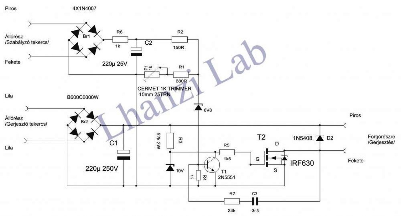 Idézet: „adtam neki akkuról 12V-t és így felment a feszültség úgy 150V-ig. Gondolom a szabályzóval történt valami. Az az érdekes, hogy a gerjesztési kapcson terheletlenül mérni lehet 14.5V-t de ha rádugom a kefe saruira a kivezetéseket, szinte semmit nem lehet mérni (1.5V).” Ez kb azt jelenti, hogy a fet nincs nyitva egyáltalán. Vagy megszakadt, vagy a 6v8 zener irányából jön sok fesz és kinyitja a T1-et, ami lesöntöli a fet gate-t, vagy a tranyó lett C-E zárlatos.