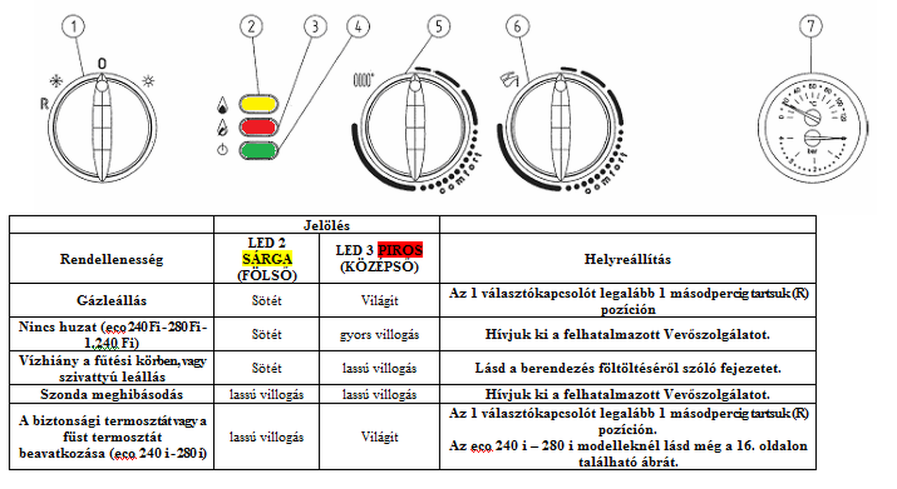 A szivattyúnak mindkét esetben mennie kell, mert van másodlagos hőcserélője a HMV készítéshez és abba is a szivattyúnak kell belekeringetni a vizet. A zöld led feletti piros led az hibajelzés és azt "R" állásban lehet(ne) törölni, a felső led az az égő működését jelzi.