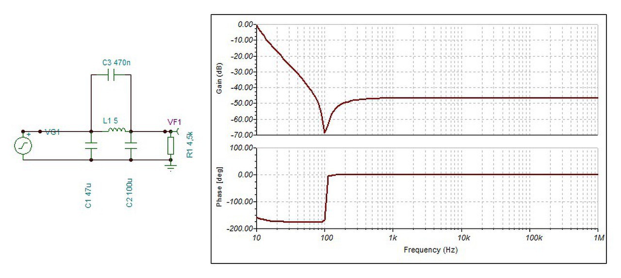 Én a fojtóval párhuzamosan nem tennék semmilyen kondenzátort, mert rezonanciára lehet hajlamos, ami rosszabb, mintha semmi nem lenne ott. A fojtótekercs elhelyezése is lehet kritikus, minél messzebb a bemenetektől és a hálózati transzformátortól is.