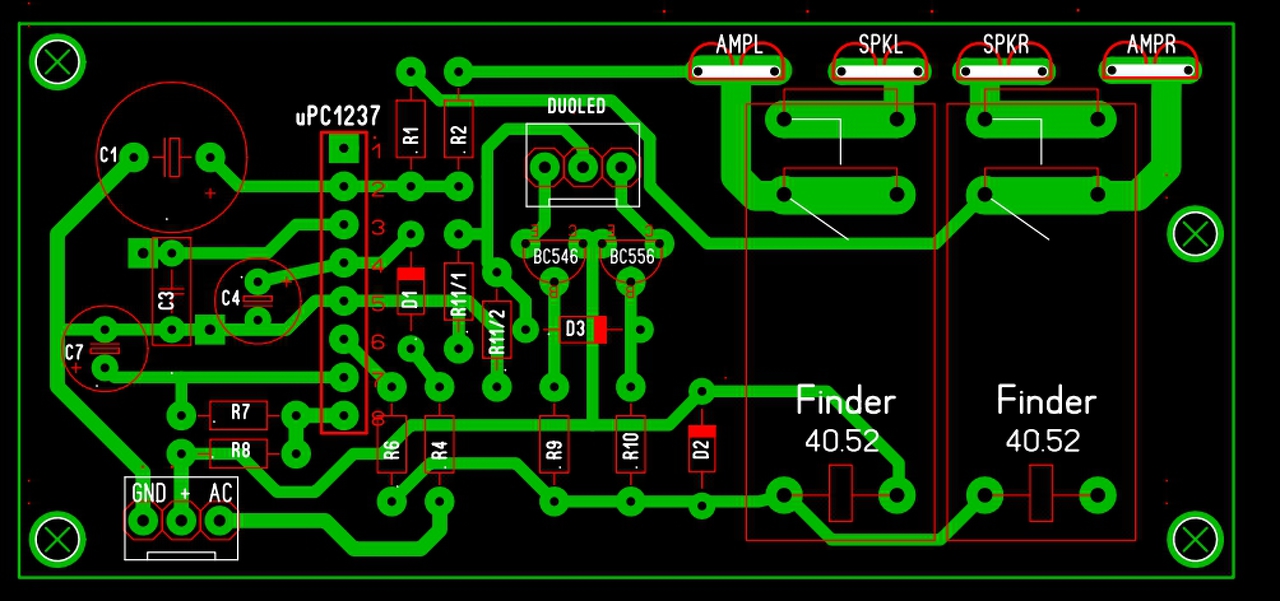 Elkészítem én is az uPC1237-es hangsugárzó-védő áramkört. 2 darabot kell építenem, így az átszámolandó alkatrészek értékét nem jegyeztem fel a panelre, remélem jók, de a következőképp alakulnak: DC23V-os tápfeszhez: R4 - 9,1k R6 - átkötés R8 - 6,8k R11/1,2 - 2,7k - de csak 4,7k van itthon DC35V-os tápfeszhez: R4 - 16k - 2db 8,2k sorba kötve R6 - 200R - 2db 100R sorba kötve R8 - 11k R11/1,2 - 4,3k - de csak 4,7k van itthon Továbbá módosítottam C1 értékét 470µF-ra (hosszabb késleltetés miatt), C7 értékét pedig 47µF-re merthogy abból is csak ilyen van itthon. A C3 környékén lévő 2 szögletes forrszem a RESET nyomógombját hivatott biztosítani. A hozzászólás módosítva: Jan 20, 2017