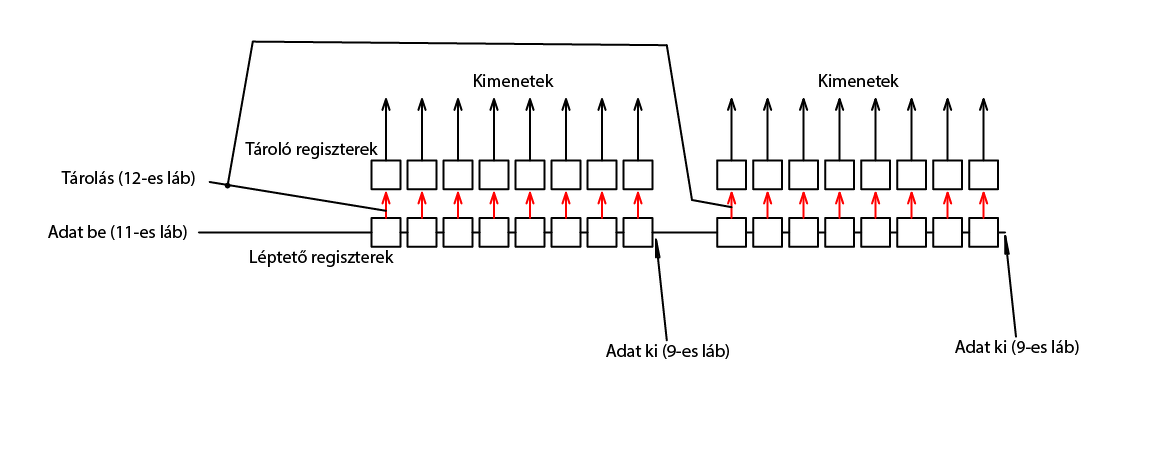 Nem olyan bonyolult az 595-ös lelke, mint elsőre látszik. Az IC-nek van egy bemeneti lába. A beérkező adat (L vagy H szint) az órajel hatására balról jobbra vándorol a rajz szerint. Egy órajel impulzus hatására a léptetőregiszterekben lévő adatok jobbra lépnek egy pozíciót. A bal oldali regiszterbe bekerül az az adat ami a bemeneten volt a léptetés pillanatában, a jobb oldaliból átkerül a következő bemenetére, már ha van következő. Meg lehet azt csinálni, hogy a bemenetre beküldesz egy csomó adatot tárolás nélkül. Ilyenkor az adat egyszerűen végigfut a léptetőregisztereken, a kimenetek nem fognak változni. Amikor a 12-es láb kap egy impulzust, akkor a léptetőregiszterek aktuális állapota átmásolódik a tárolóregiszterekbe. Itt fontos azt megjegyezni, hogy ez egy másolás, a művelet hatására a léptetőregiszterek állapota nem változik. A rajzon két 595-ös van. Ahhoz, hogy a jobb oldaliba tudj írni ilyen láncolás esetén, két bájtot kell kiküldeni. Az első bájt a bal oldali IC-be kerül, a második "átnyomja" az első bájtot a jobb oldaliba és beül az első helyére. Ha csak egy bájtot küldesz ki mert a bal oldalit akarod írni, a bal oldalon lévő adat akkor is átkerül a jobb oldaliba. Magyarán arra kell figyelni, hogy láncolás esetén mindig annyi bájtot kell küldeni, ahány 595-ös IC van felfűzve. Az elsőként kiküldött bájt az utolsóba kerül, az utolsó bájt a lánc első IC-jébe. Az órajel polaritása inaktív állapotban alacsony, az adatnak az órajel felfutása előtt már a bemeneten kell lennie. A legyegszerűbb az SPI modul bekapcsolása. Igaz, a modul átveszi a hatalmat az SDI láb felett is de egyszerű bemenetként még használható, a PORT regiszter továbbra is a láb aktuális állapotát mutatja.