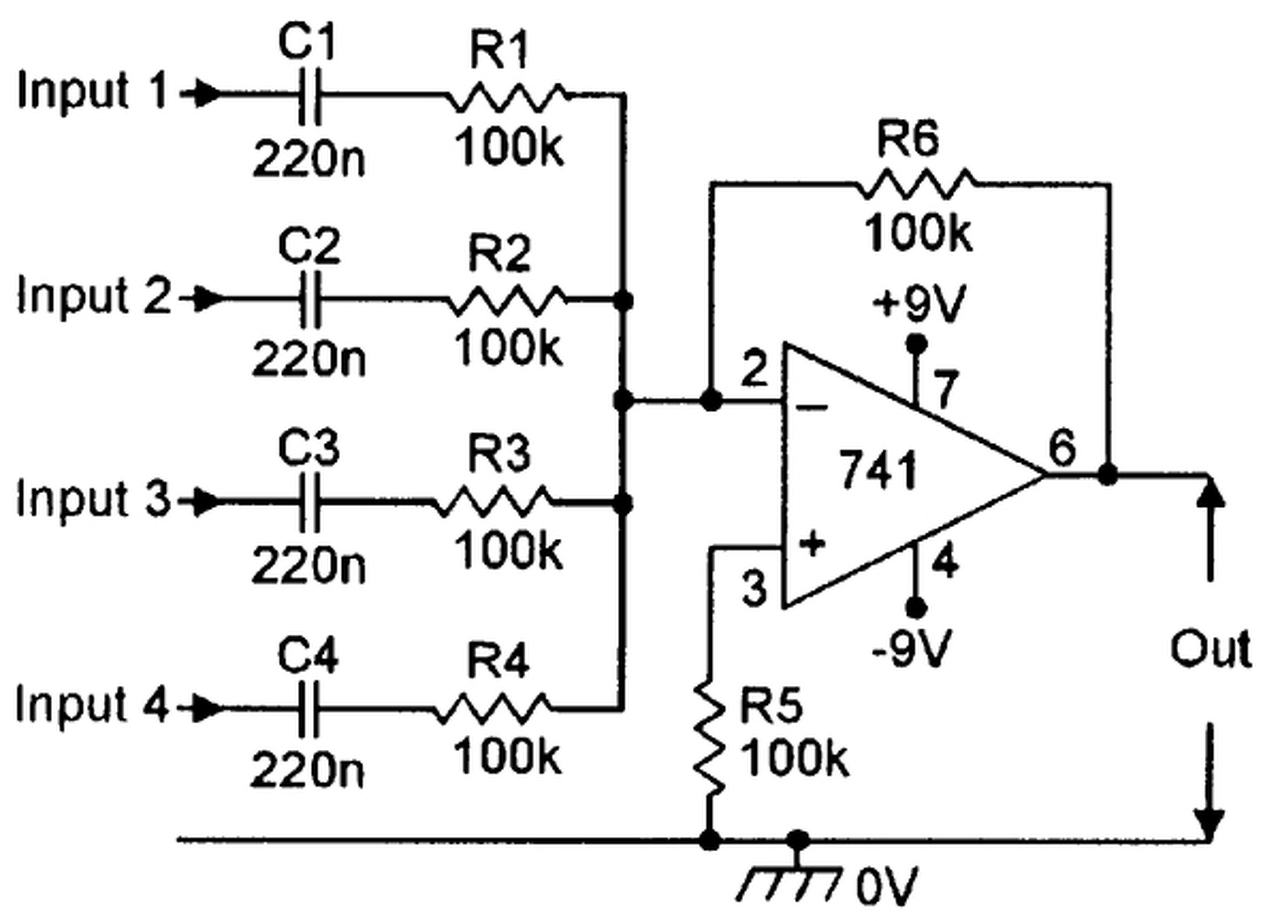A műveleti erősítő 13-as lábbal jelölt bemenetére ideális esetben úgy tekinthetünk, hogy ott nincs feszültségváltozás, az áramok eredőjének kell nullának lenni. Ennek tükrében vizsgálva egy vonali bemenetet, nem jöhet szóba a jelek előzetes keveredése. Kipróbált dolog ez, esetleg én nem magyarázom elég világosan.