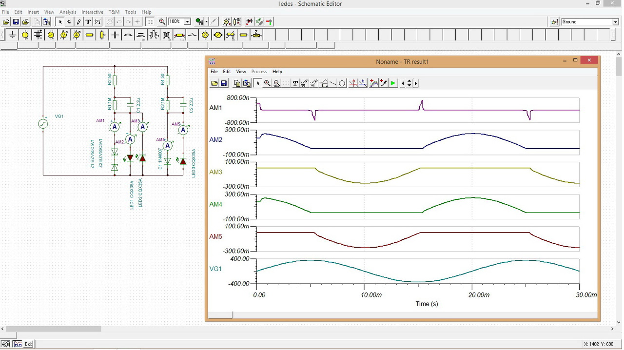 A mellékelt rajzon szeretném látni az áramokat/feszültségeket. Szándékom szerint az elején egy feszültséggenerátor a 230V/50Hz hálózati feszültséget állítaná elő. Az utána következő műszerek viszont mintha pillanatnyi értékeket mutatnának. Milyen analízist kéne elindítanom, hogy a váltóáramú résznél az effektív értékeket mutassák a műszerek, és az egyenáramú résznél is legyenek mérési eredmények??