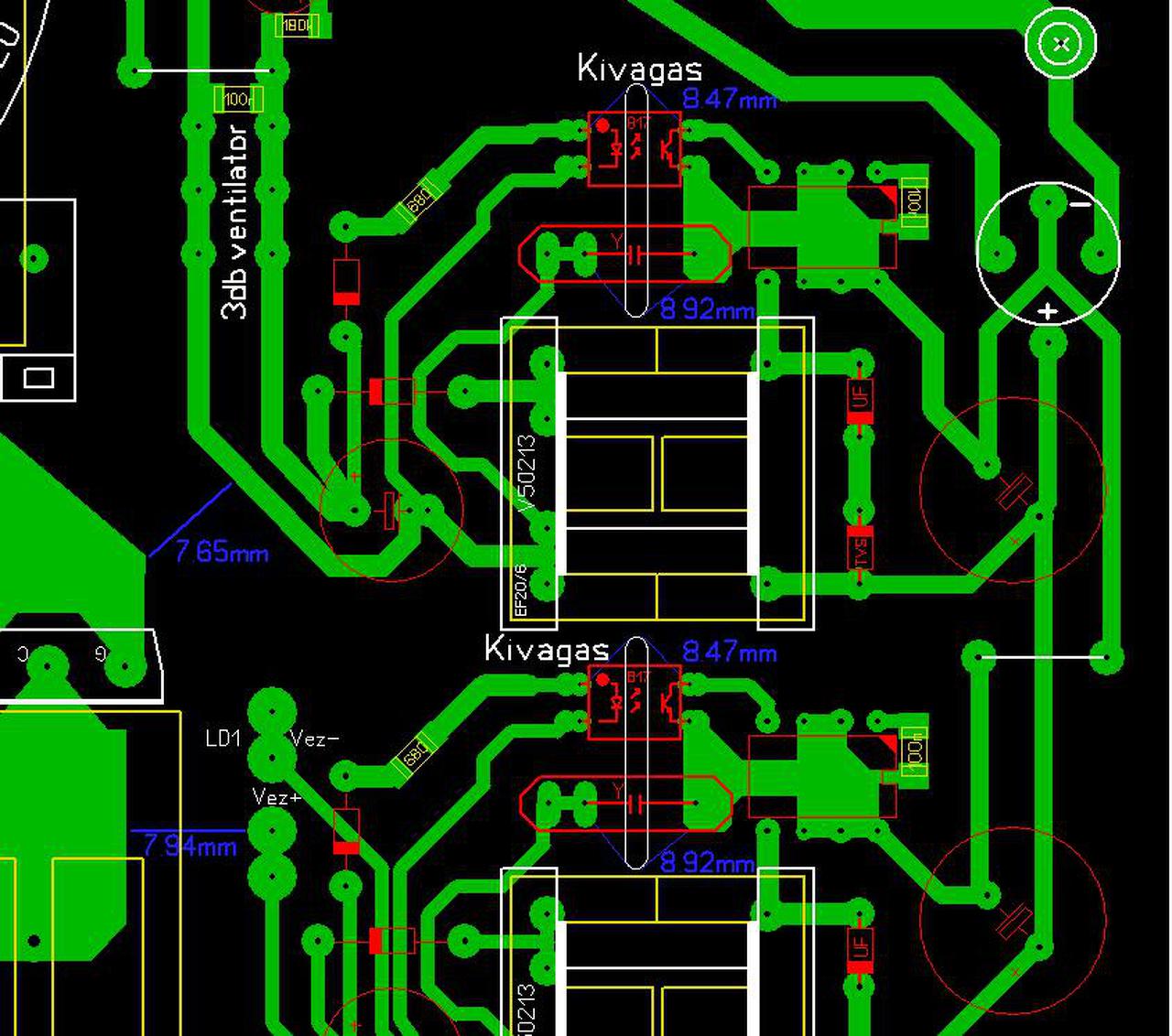 Idézet: „És a problémám sem azzal volt hogy észrevettél egy nem kellő távolságban lévő vonalat, hanem azzal, hogy ott vetted észre és bizonygattad ahol olyan nem is volt.” Mivel az optó és az Y kondenzátor alatt fémes rétegen forrszem volt és nem volt odaírva, hogy az kivágást jelet, az egész ventilátor és LD1 vezérlő részt a hálózattal összefüggőnek kell tekinteni. Tény, hogy elsőre ezt ettem észre, nem a vezérlőpanelnél levőt. Bocsánat. Ezért is írtam, hogy a tervezőnek kell ellenőrizni (ellenőriztetni), hiszen Ő tudja legjobban, hol is vannak a kritikus pontok. Egyébként csak a furatot megkerülve az optocsatolónál 6.12, az Y kondenzátornál 6.1 mm, a forpont fémes részét is kifúrtnak tekintve 6.35 illetve 6.13 mm kúszóút mérhető. Nem rendelezik a terv olyan információval mekkora fúróvall is kellene kifúrni. Idézet: „Egyébként tudok neked mutatni nem egy olyan PC tápot meg DVD tápot ahol egyáltalán nincs kivágva az optó alatt a nyák, és 5,5mm a kúszóút...” Ezeknél a berendezéseknél a panel felületét gyárilag bevonják szigetelővel. Ha az sem teljesíti az előírásokat Őket veszik elő. Részemről vége. A hozzászólás módosítva: Márc 12, 2017