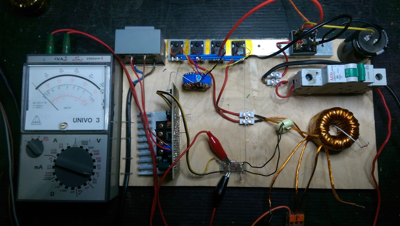 Üdv. A mag(ok) 2db talán a váci talis származású, kollégámtól kaptam. Van vagy 15 éves, valamikor autó végfokot csináltak és a tápjához vették, egy egész tálcával kaptak. Na ebből van 4db nekem. Méret: 41x25x12,5mm. Van E55, E65 is majd beledobom. Kitaláltam hogy összeragasztok kettőt akkor kicibálok belőle olyan 1000W-ot. P=Ae2x4xf adta meg, kb. 2cm2 keresztmetszettel.B.0,2 vel és 290V-al a Skory féle számoló 28menetet adott 16szál 0,22-es huzallal. A maradékot is rátekertem nem akartam pocsékolni a kaptonnal bebandázsolt vezetéket, így 33 menet lett. A szekunder pedig egyszerre tekert 2x9 menet. A hidat 80-100V-on járatva még semmi nem volt. Majd a leválasztómra kötve elment, mert az alusín alatt athúzott a matricás szigetelés. IRFP460-akat tettem bele így most a trafó üresben langyos 5-10 perc alatt. A híddal sorbatettem mikróból kibontott grill fűtőszála(ka)t mert nem merem nagyon terhelni. Azért mert az áramváltós szabályzás, vagy (tiltás) még nem tudom jó lesz e. Azt már láttam a szkópon, hogy a kis 60 menetnyi kb. 2cm-is kis gyűrűt (lezáró 22 ohm, utána graetz majd 470 ohm és 500 ohm helitrimer ugyancsak lezárónak ezután 494 4-es láb) bárhogyan rakom a primer bármelyik szálára fordítva vagy sem, ugyan az a furcsa repkedő háromszög, vagy nem is tudom talán fűrész szerű jel van ha pillanatra rövidrezárom a szekundert. A gate jel beállításával mérve szkóppal a tekercs lezárón olyan ez, mintha a gate jelnek megfelelően minden harmadik negyedik periódus lenne egy háromszög jelből. HA ekkor rövidzárnál a gate jelet nézem ami a bd-k után van, kisebb kitöltéssel kivehető ugyanilyen repkedő jel lesz amiből csak minden harmadik negyedik periódus van meg. Nehezen vehető ki, olyan mintha a szkóp hibás lenne és nem tudnám megállítani a jelet. Ahogy olvastam régebben valami ilyennek kéne lenni. Amúgy a gate jel gyönyörű szép trapézjel (bár a gate trafó túlontúl nagy is).