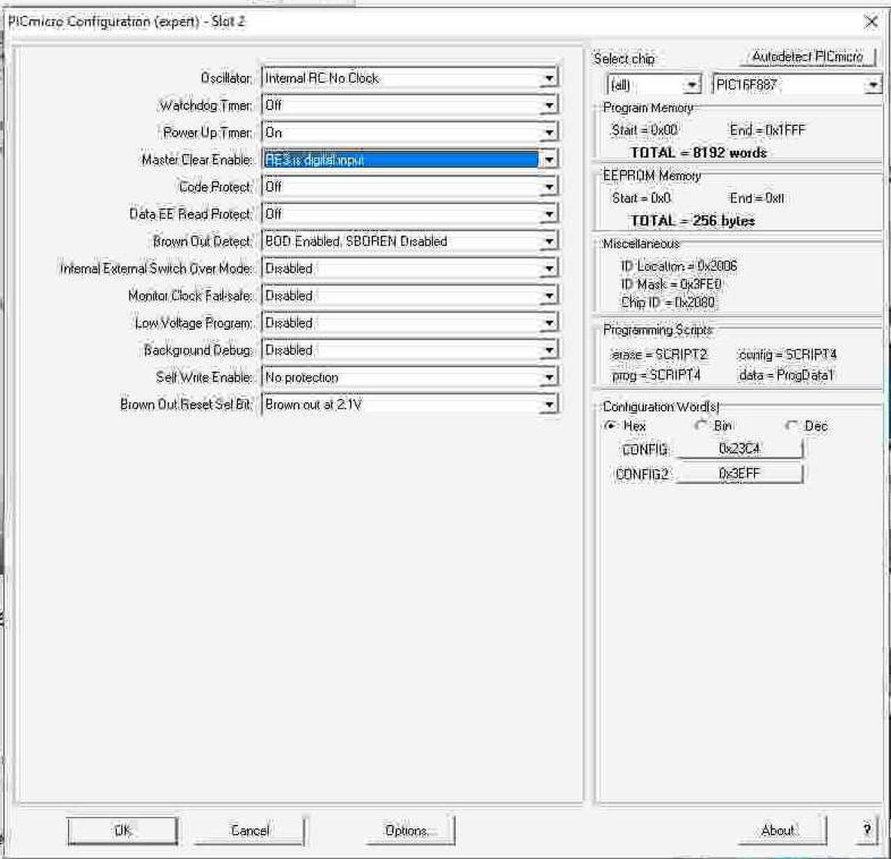 A beállitások jok ? intrnal no clock ? Nem lehet hogy itt a bibi ? Talán menne ha internal clock ra volna állitva (de szivem szerint egy kvarcot is megérdemelne egy ekkora pic ..) Ezért utálom a belsö rc oszcit én mindig kvarccal hajtom a picet , az tuti indul és nincs gond