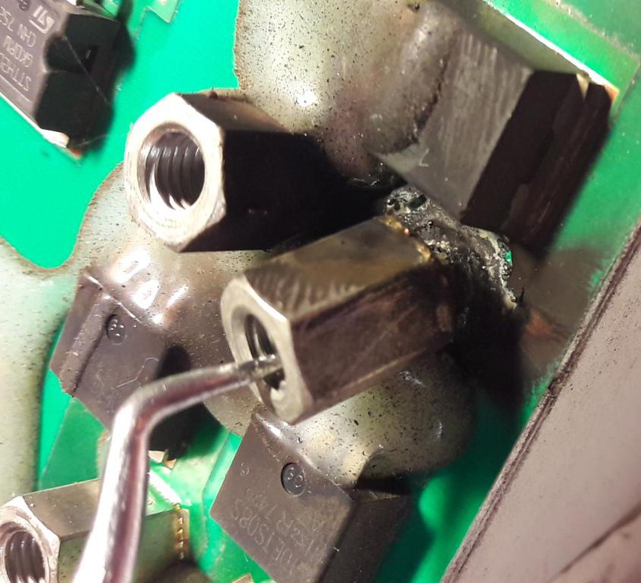 A topikot átolvasva felbátorodtam és elkezdtem javítani egy GYSMI-161 típusú inverteres hegesztőt. Ismerősöm kapta már hibásan, „ajándékba”. Az előéletéről annyit tudni, hogy pukkant és kijött belőle a füst. A képeken látszik is, hogy honnan jött ki a füst. A neten való keresgetés után reméltem, hogy csak a távtartó-átvezető adta meg magát. Sajnos a mérések szerint a hálózati egyenirányító 2 diódája is zárlatos lett. Na innen kellene egy kis segítség a tapasztaltabb kollégáktól. 1. Érdemes-e foglalkozni vele? 2. Okozhatott-e a két dióda halála (zárlata) további hibát, 3. Hogyan tudom (mit) kimérni, 4. Hogyan érdemes a borda panelján lévő alkatrészeket (teljesítmény kör) ellenőrizni (mert ugye kiforrasztani elég mókás lenne), 5. A hűtőbordás panel nélkül, egy greatz-et közvezlenül a vezérlőpanelra kötve lehet-e (érdemes-e) bekapcsolni és pl. a meghajtó kört ellenőrizni?