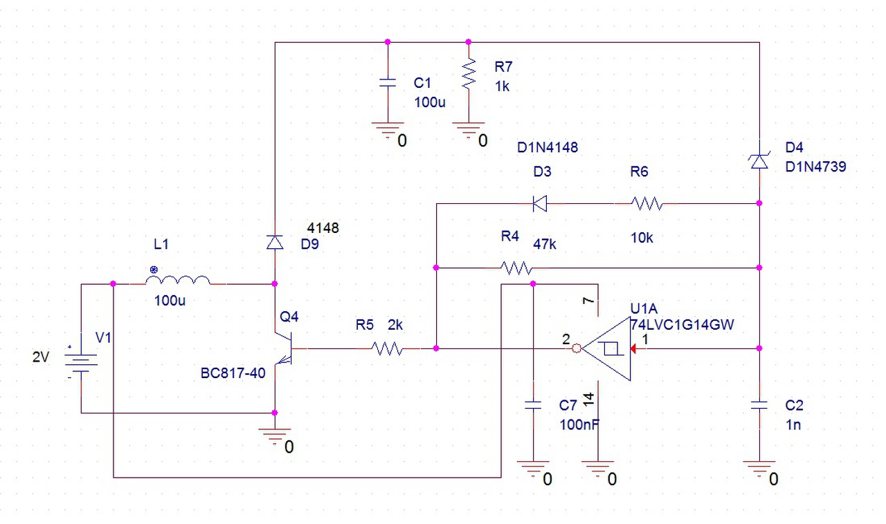 Szimulációban jól futott. Ha a 74LVC1G14GW lecseréled egy alacsonyabb feszültségűre pl NC7SP04P5X akkor még alacsonyabb feszültségről akár 1V-ról is üzemel. A kimenőfeszt a D4 zener állítja. A kapcsolófrekit pedig az R6 R4 C2 állíta be önrezgőre.