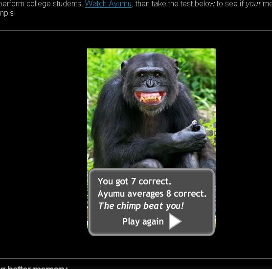 aztán a teszt: http://games.lumosity.com/chimp.html nekem (eddig) csak 6-ot sikerült megcsinálni