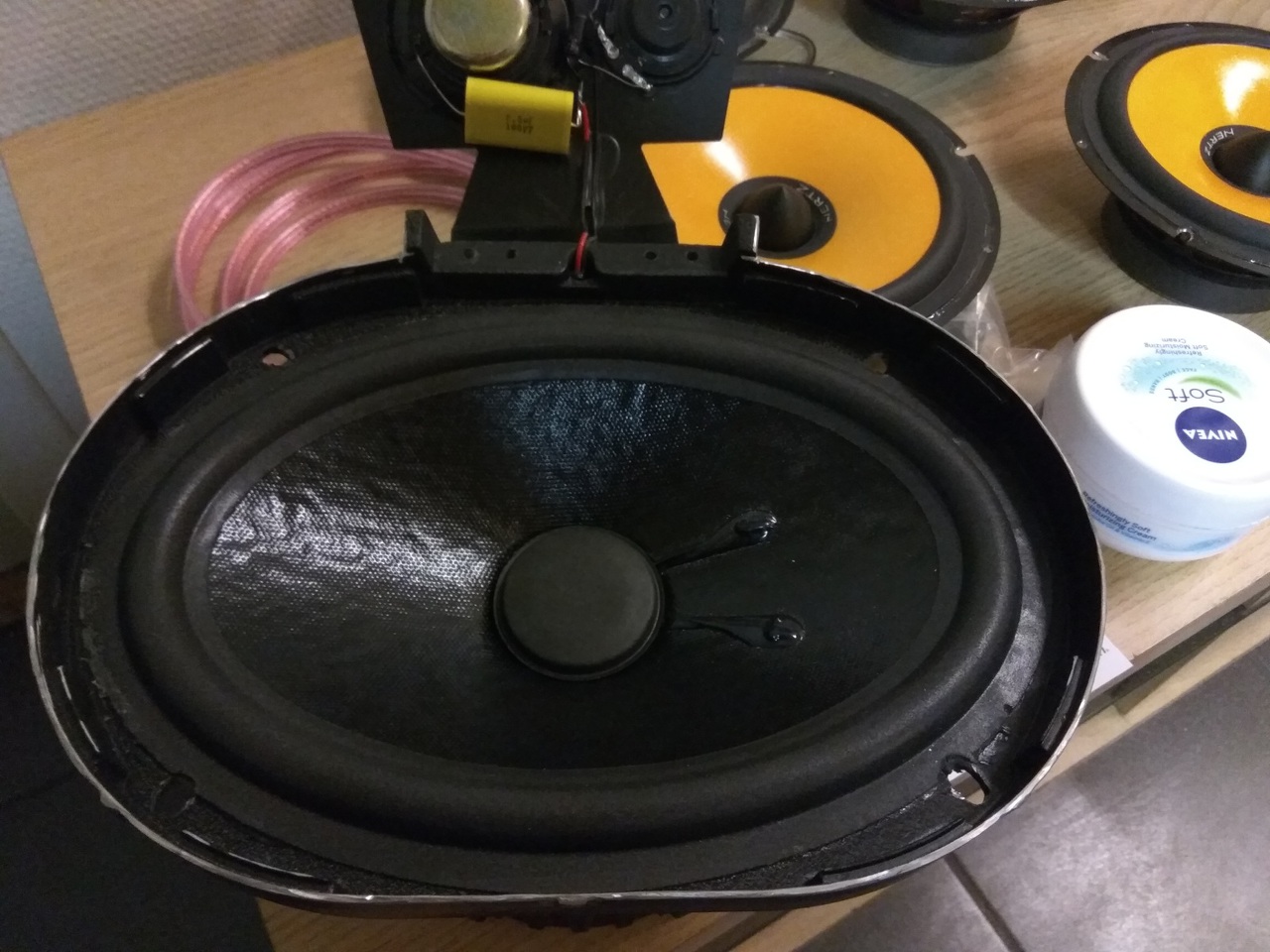 Olvastam a régebbi discoust és sejthető volt az izlés számomra. Ezért ajánlottam. Unióból vámmentesem rendelhető akár 10€ +posta/pár (www.evita.lt). Kifutó modell. Erről lekapva a közepet és a magasat, egy nagyon jó mély-mélyközép hangszóród lehetne. 20l-es, sebtében ácsolt, vezetéktesztes ládában csodálatosan szól. Csak a vagdosott kasznilemez alá, alákell deszkázni, hogy a rezonancia miatti torzítások kiküszöbölhetőek legyenek. Kb. 4000-től dolgozik a "közép"párhuzamosan. Addig pedig nagyon jó az átviteli görbéje. 30Hz-es aktív 24dB/oltávos aluláteresztő szűrőnél még volt hangja. Erről le van vágva félig a díszkeret, mert így fért be a kárpit alá.
