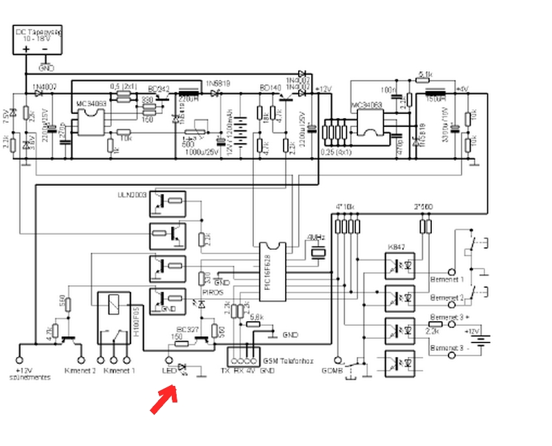 A kérésem az lenne, hogyan lehetne a mellékelt riasztó kapcsolási rajzán a második (piros nyíllal megjelölt) LED helyére csatlakozva egy kis egyszerű áramkört építeni 12VDC táppal és relével. A két LED élesítés esetén világít. Segítségeteknek nagyon örülnék, különösen ha kapcsolási rajzal lenne alátámasztva.