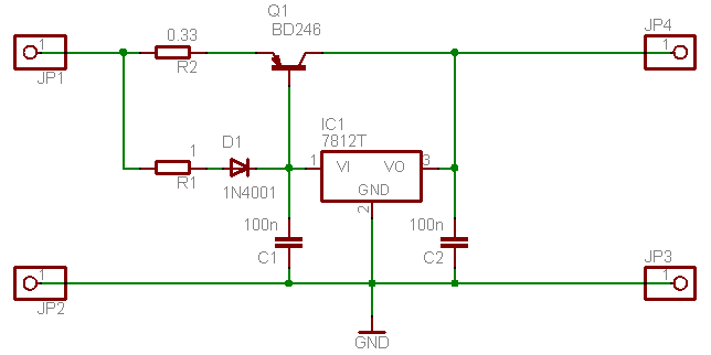 De nézzük meg közösen, hogy is működik ez. 1. eset: Terheletlen állapot. Az F1 biztosítón, és az R1 ellenálláson keresztül eljut a tápfesz a 7812 bemenetére. Az IC belső áteresztő tranzisztora lezár, mikor a kimeneten a fesz eléri a 12V-ot. A T3 nem csinál semmit. 2. eset: kis terhelőáram, mondjuk 30mA. Ekkor az IC bemenetére eljut a tápfesz, de az R1-en még mindig nem esik, csak 0,3V, így a T3 még mindig nem nyit ki, tehát továbbra sem csinál semmit. 3. eset: Nagy terhelőáram, mondjuk 2A. Ezt a 7812 már nem bírná el, a belső védelme korlátozná a kimenő áramát, ezáltal letörne a kimenőfesze. A T3 tranzisztorral kiegészítve azonban, mikor az R1-esen eső feszültség eléri a T3 nyitófeszültségét, az kinyit, és a kimenetre akkora áramot ad, hogy az IC-n lévő maradékáram, az R1-en feszültséget ejtve továbbra is fenntartsa a nyitófeszét. Kizárólag arra szerettem volna felhívni a figyelmedet, hogy ilyenkor kizárólag a T3 nyitófesze juthat az ellenállásra, tehát az IC-n sosem fog akkora áram folyni, hogy az áramkorlátozása működésbe lépjen. Más meg nem akadályozza az áram növekedését. Tehát: A kapcsolás jó, csak vannak korlátai.