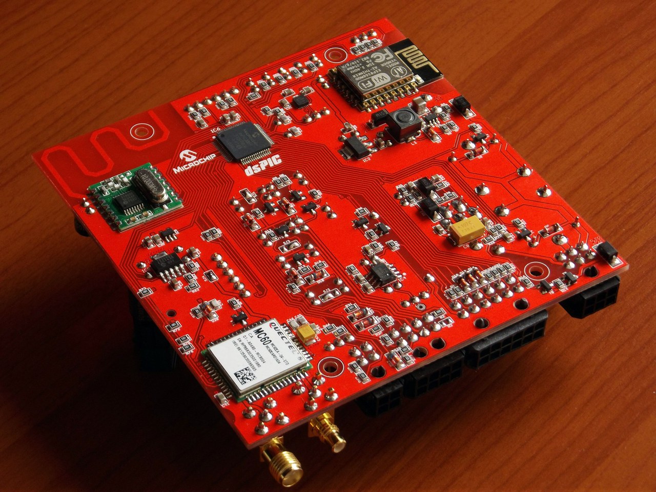 A panelen van egy 16 bites 64 lábú dsPIC, egy Quectel MC60-as GSM/GNSS/Bluetooth modul, egy ESP8266-os WIFI modul, egy 868MHz-es sima rádiós adó-vevő modul az opcionális távirányító kezeléséhez, egy 3/3/3 tengelyes giroszkóp/gyorsulásmérő/iránytű, két teljesítmény végerősítő meg néhány relé és egyéb dolog. Az elektronikához lehet csatlakoztatni egy tasztatúrát (Bővebben: Link), a felhasználói azonosítás (immobilizer kiblokkolás) alapvetően a tasztatúrán beírt kóddal történik. De az elektronika úgy van kiképezve hogy a tasztatúra helyett ugyan erre a csatlakozóra RFID olvasó és ujjlenyomat-olvasó is csatlakoztatható ha arra van igény. A relék a teljesen saját elektromechanikus motortérzárat (Bővebben: Link) vezérlik illetve a központi zárat tudják nyitni/zárni. Meg az elakadás-jelzőt villogtatni, vagy ehelyett bármilyen egyéb funkcióra használhatóak. A két végerősítő közül a kisebb az utastérbe szerelendő kis hangszórót hajtja meg, a nagyobb (14W) pedig a motortérbe elhelyezett nyomókamrás hangszórót (szirénát). A panelhoz csatlakoztatható egy opcionális külső modul; egy OBDII interpreter amely segítségével a mikrovezérlő az autó ECU-jától lekérdez olyan adatokat mint például a fordulatszám, motorterhelés, gázpedál-állás, vízhőmérséklet stb.