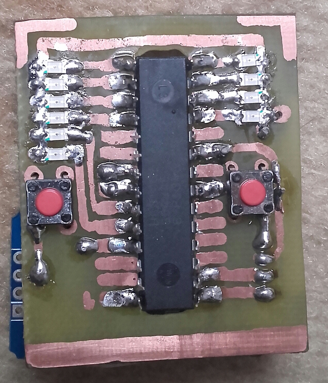 Építettem egy BCD kódos órát, egy ATMega48PA köré és gondoltam megosztom veletek. Nem a legszebbek a forrasztások, nem a legegyedibb az ötlet, de én mégis büszke vagyok rá, mert ez az első olyan projektem, ami nem csak prototípus építés vagy tesztelés egy arduinoval. IIC buszon kapja az időt, a tápja egy CR2032, 1MHz-es belső oszcillátorról megy. Egyik gombja tápfeszt kapcsol az uC-re, a másik az időt állítja. Még mindig van 300 bájt hely a flash memóriában, ha esetleg valami eszembe jutna még és változtatnék rajta A hozzászólás módosítva: Ápr 25, 2017