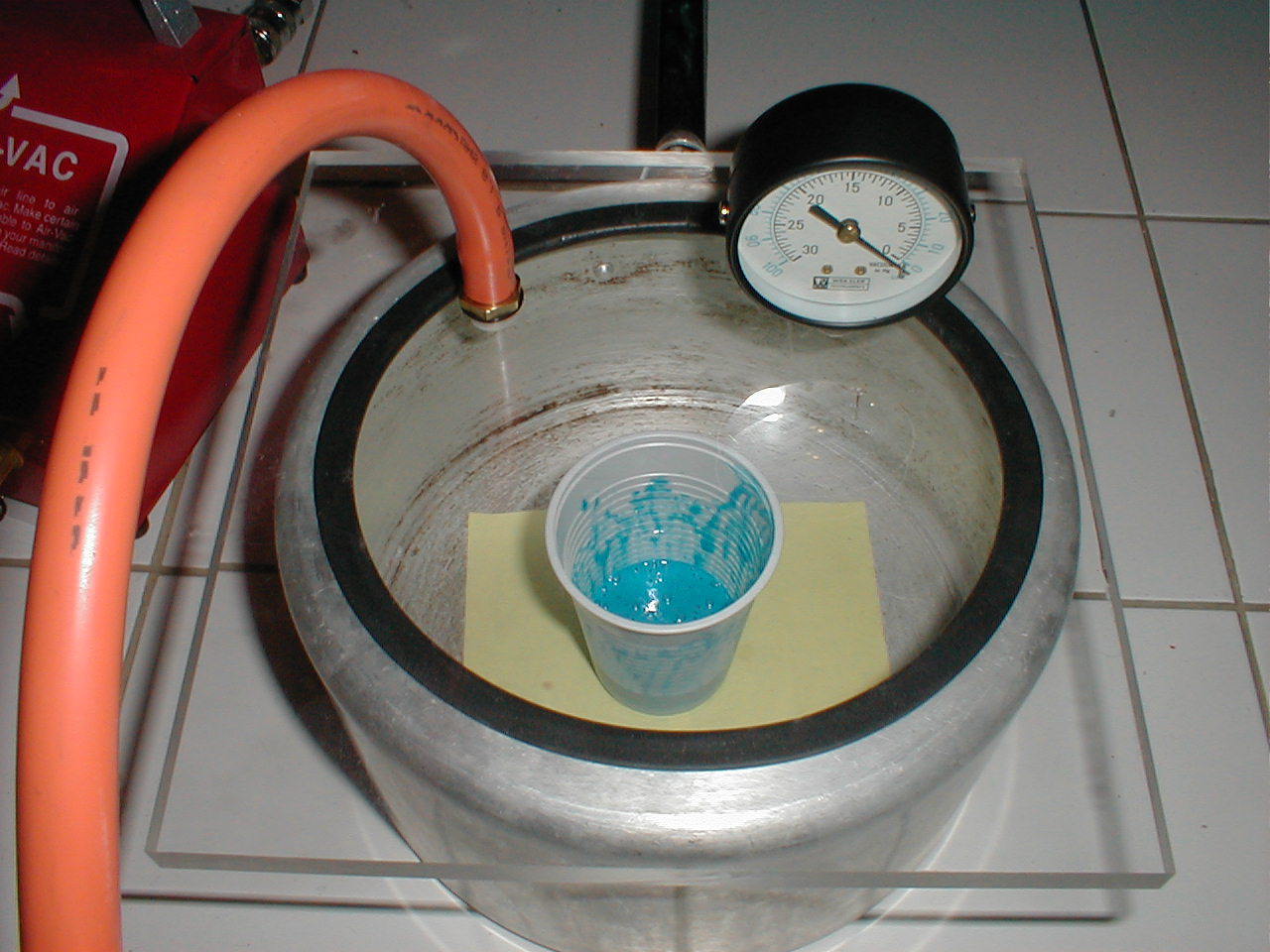 Ha a szívó oldalra átlátszó -mondjuk szilikon- cső kerül akkor látható ha beleszalad a folyadék. Nem a legjobb, de láttam ilyen megoldást és működik. Akkor nem kell átlátszó tető. Bár mint írtam szerintem akkor van kész a munkadarab, ha már nem jön belőle buborék. Így mégis jobb ha látjuk... De kipróbálni így is teljesen jó szerintem. A minőségén csak javíthat!
