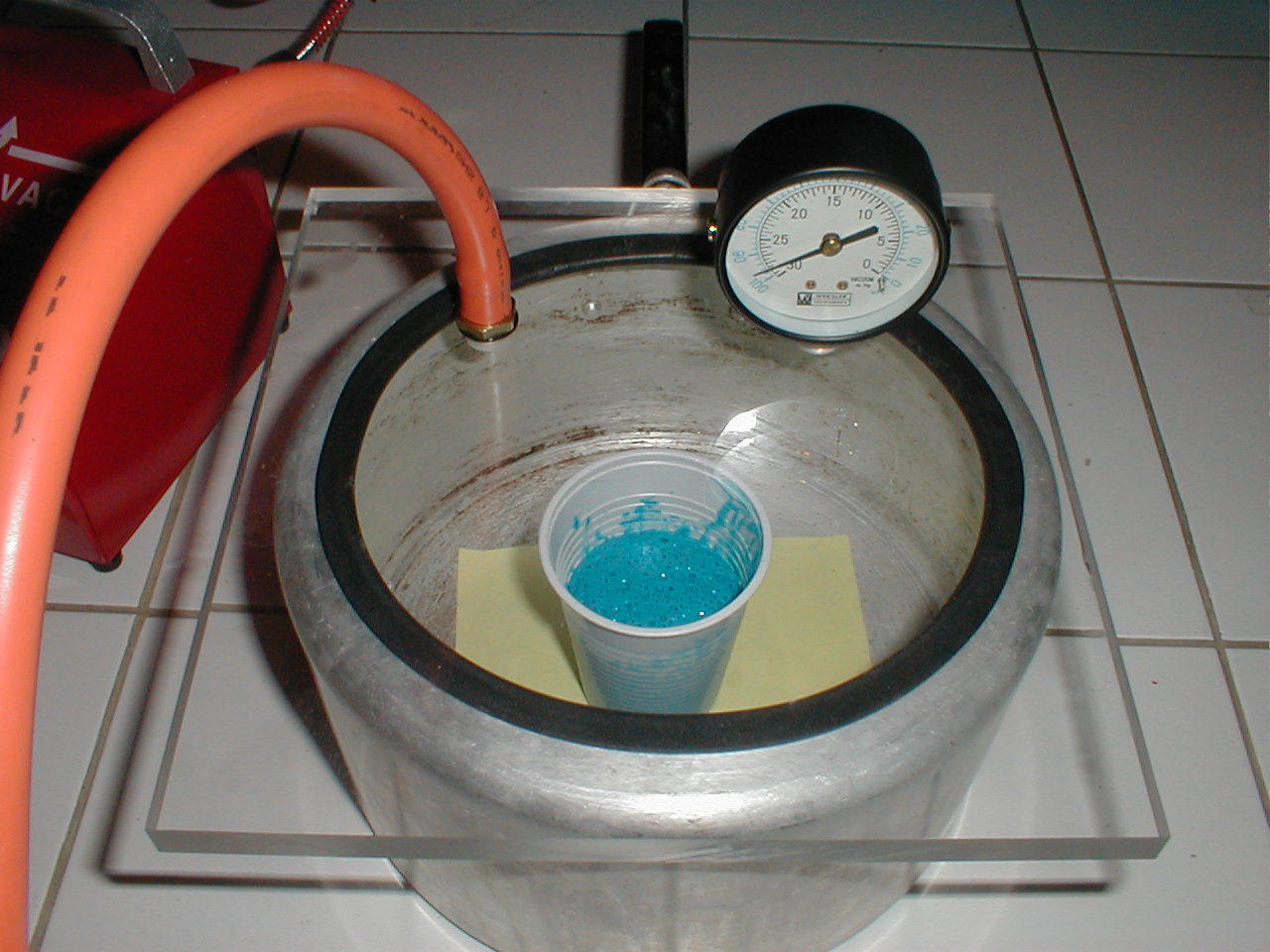Viccet félre, megkerestem a képeimet. Az az anyag, amit én használtam, kb. 4x térfogatra tudott tágulni vákuum alatt a bezárt légbuborékok miatt, ahogy a levegő a felszínre jött és eltávozott, természetesen összeesett az anyag.