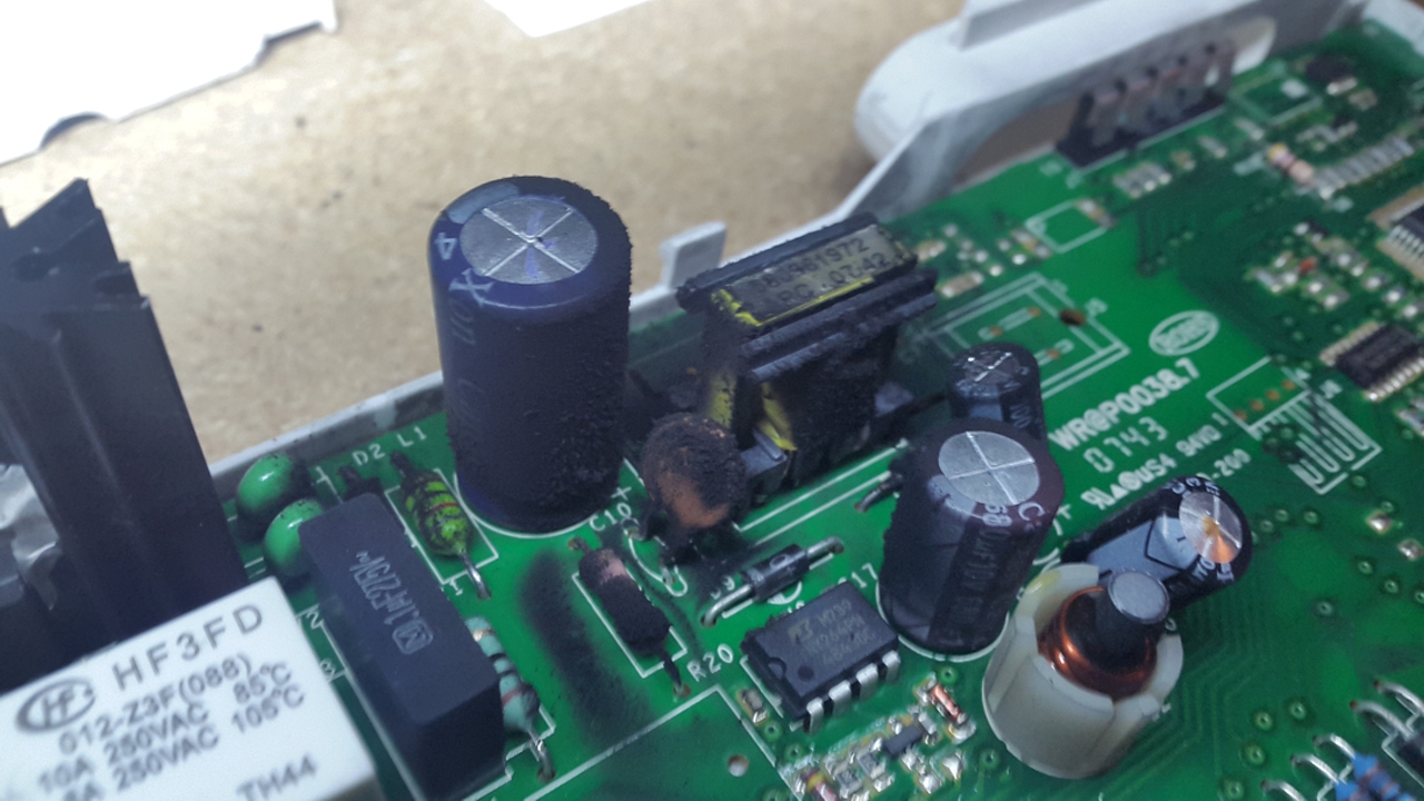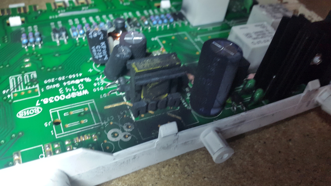 Palko, Zolika és Botesz javaslatai szerint (hálás köszönet!) kikötöttem a zavarszűrőt és szétkaptam a vezérlőpanelt. Utóbbinak kívűlről semmi baja nem látszott, aztán szétszedve már teljesen más a helyzet. Nejemnek mutatom: "Még jó, hogy nem égett le a lakás."
