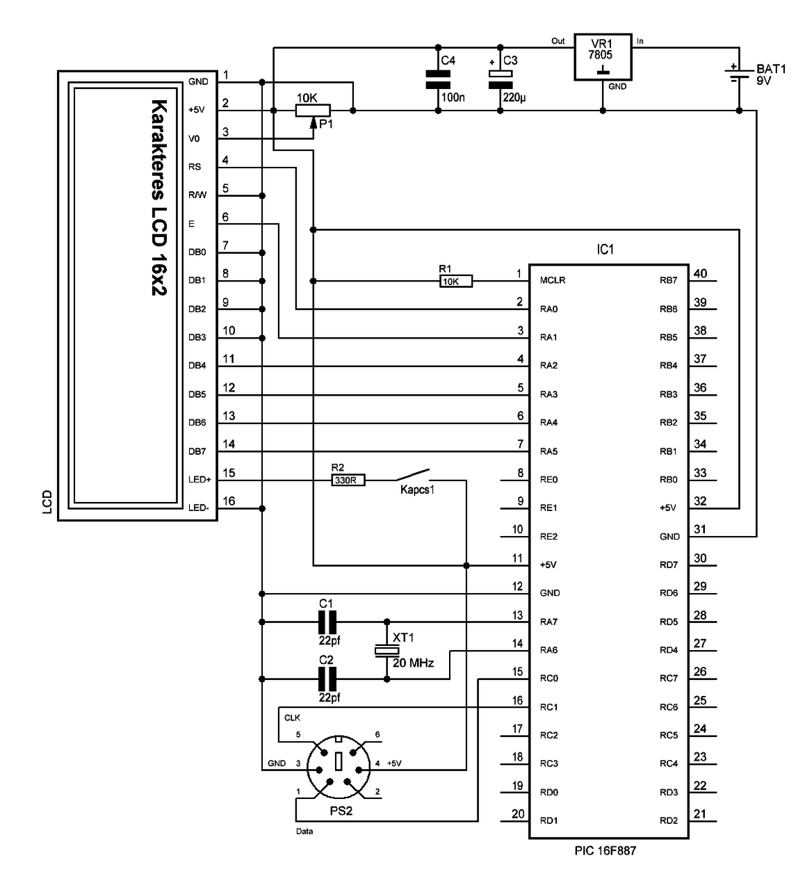Mennyi a tápfeszültség a PIC-en, az LCD-n, polaritás jó-e, kvarc lábon van-e oszcilláció, milyen frekvencián, és mennyi az áramfelvétele az egésznek?